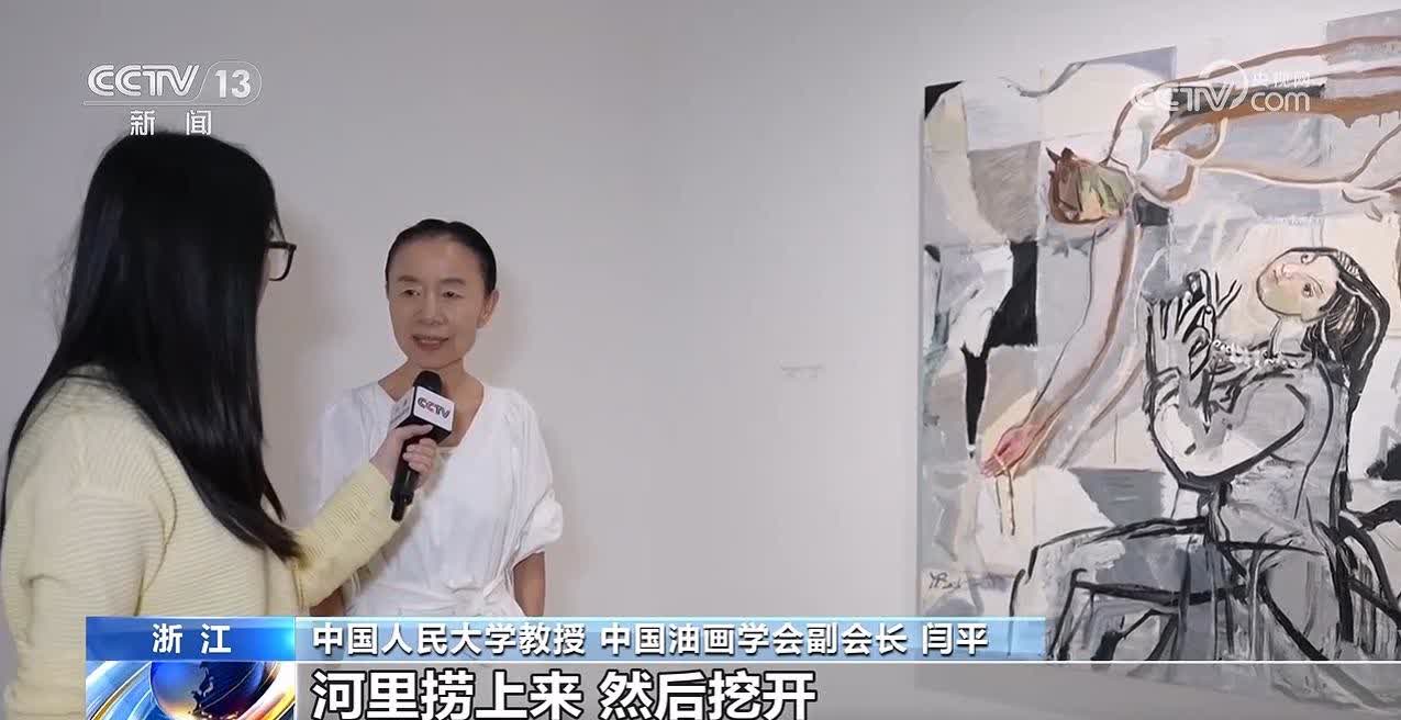 中國人民大學教授、中國油畫學會副會長 閆平:諸暨是世界珍珠之城,世界有60%的珍珠是出自於諸暨,珍珠的產生過程讓我非常非常感動,畫了這張作品,這張畫就叫《你吸引我》。畫面裏呈現的就是從河裏把蚌撈上來,挖開,然後變成了珍珠,變成了一種文化的象徵。
