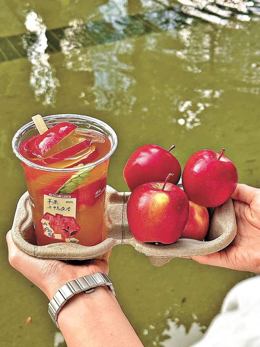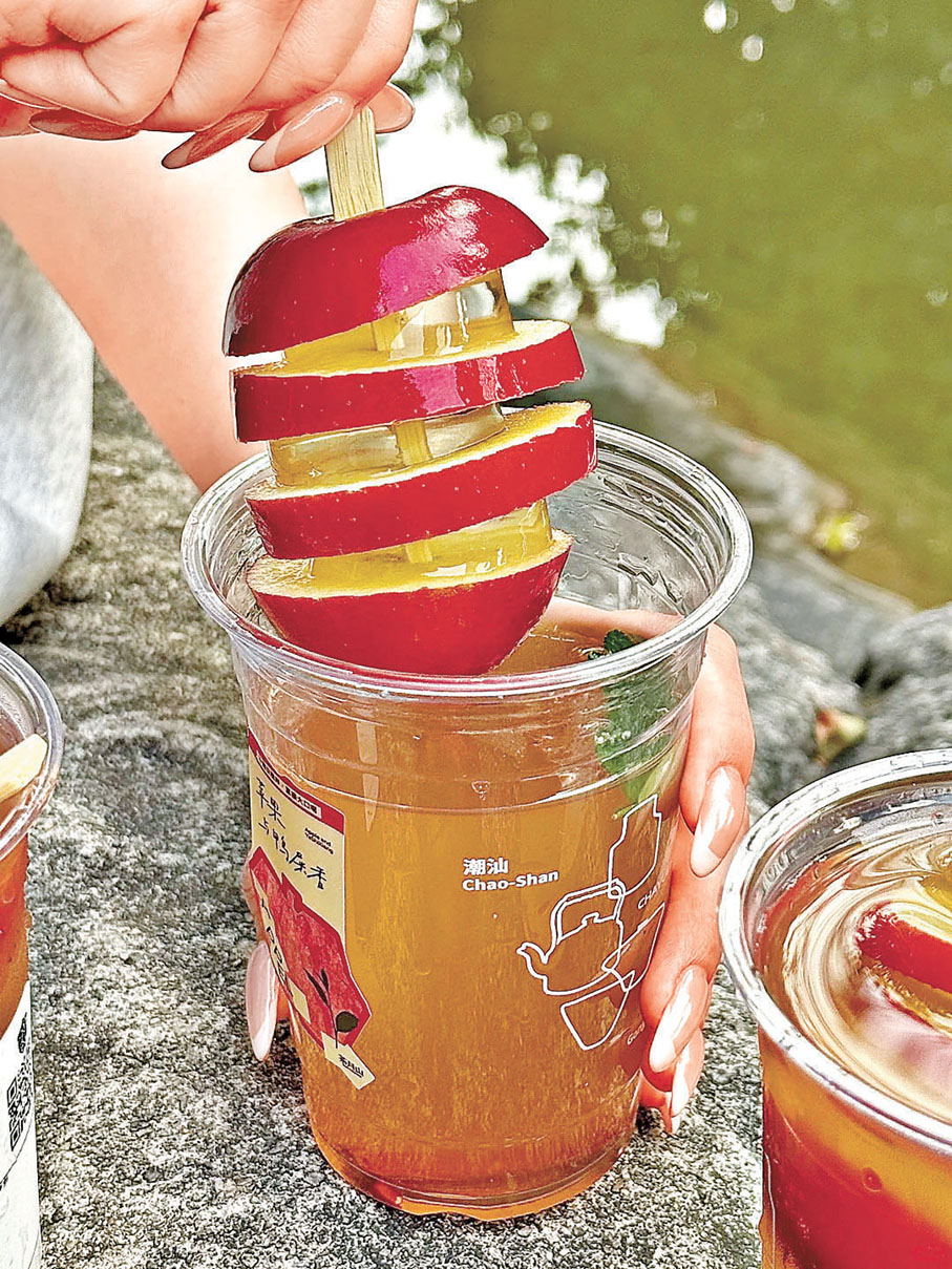 不少人喜歡飲鮮果茶,因為味道清爽,比純茶有滋味,比奶茶更健康。不過不少茶飲店的果茶是看不見水果的,或者是採用果切和水果罐頭。但是,在茶飲品牌茶月山的新品「解構蘋果2.0」中,你就真的能看見完整的一個蘋果了。店舖選用新西蘭進口的樂淇蘋果,這種蘋果的特點就是個頭較小,正好可以放入飲料杯中,並且清爽脆甜,一口咬下去滿滿汁水。最主要的是蘋果的處理方式,整個果子被橫切成四個部分,除去蘋果核,中間用清爽的椰青凍連接。以這種方式呈現,不但將切開後汁水充盈的果實內部具象化,更保留了完整的造型,既美觀又方便食用。蘋果串泡在清澈的琥珀色茶湯中,光線穿過呈現強烈的分割效果,隨手一拍就是藝術品。並且,由於蘋果自帶天然蠟質外衣,能夠保持4小時不褐變,為大家保留了足夠的時間打卡並享用。在喝茶的同時,還能吃完一整個蘋果,為身體補充膳食纖維和維生素C,是當之無愧的健康飲品。茶飲中還加入了肉桂,增添特殊風味,當然對於一些不喜歡肉桂濃烈氣味的人,也可以選擇不加。這款全新升級版本的「解構蘋果2.0」在4月重新與大家見面,如果去到廣州,真的要試一下。
