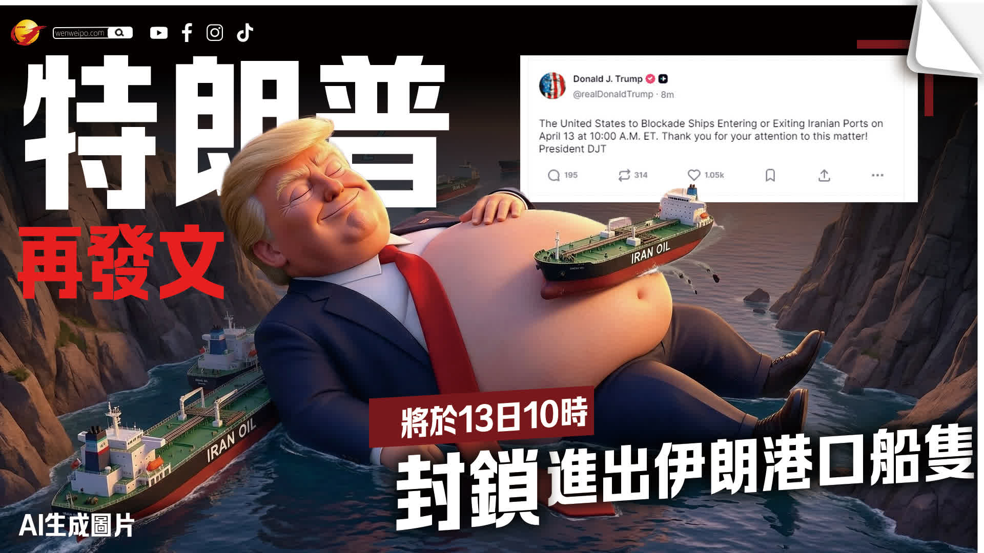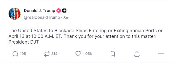 美東時間13日凌晨,美國總統特朗普在個人社交媒體平台上再次發聲稱,美國將於美國東部時間4月13日上午10時對進出伊朗港口的船隻實施封鎖。