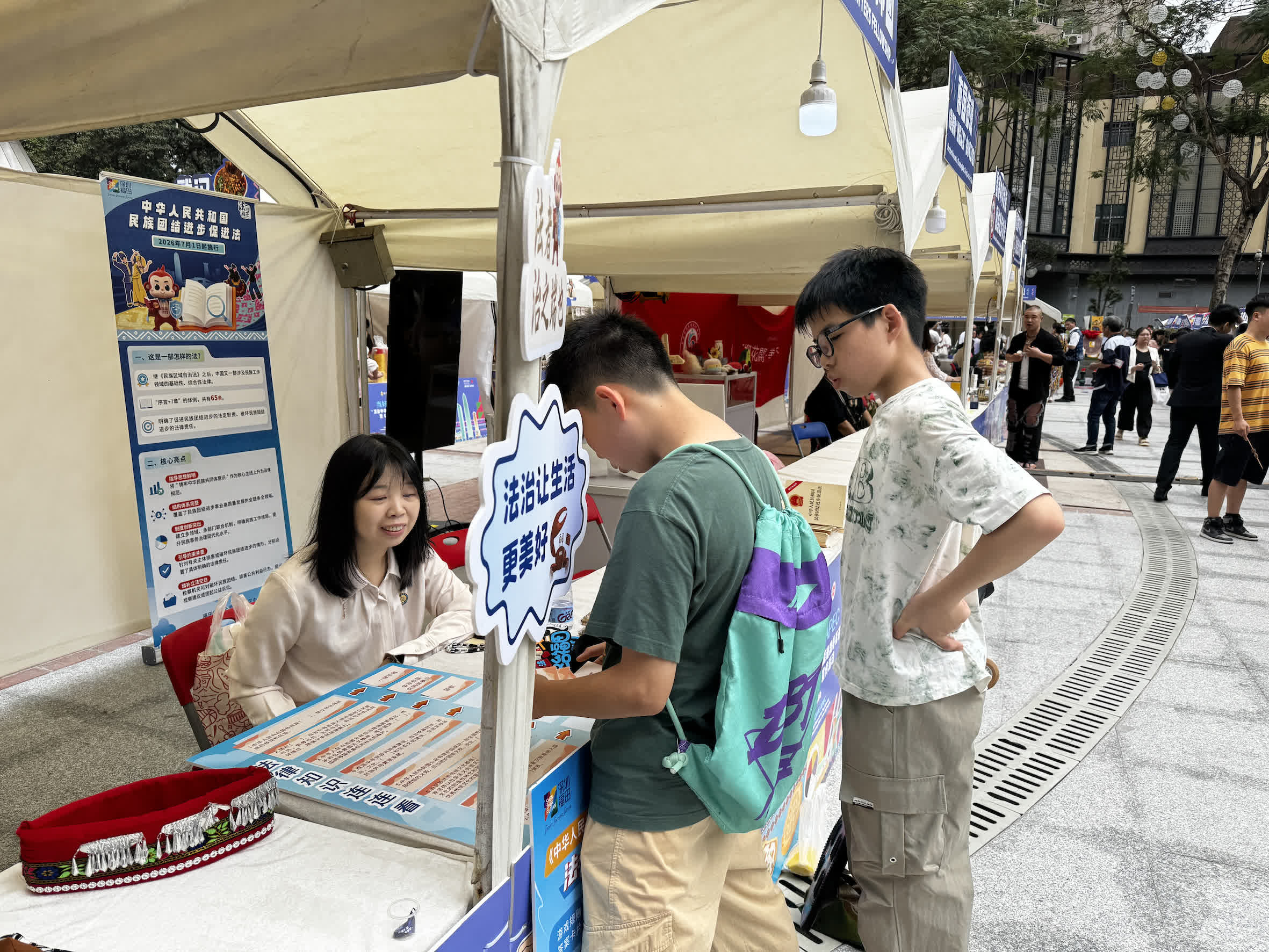 此外,本次「民族同心 築夢福田」城市民族工作光影展圍繞「光影見證交融 同心鑄牢認同」主線,系統梳理並展示了福田區近年來推動民族工作高質量發展的扎實足跡,共展出33件攝影作品。《民族團結進步法》宣傳區同樣熱鬧非凡。福田區民生律師團的律師們面帶笑容,用貼近生活的案例和通俗易懂的語言,向過往群眾講解《民族團結進步促進法》的主要內容和現實意義。在水圍文化廣場非遺手工藝展示區,現場集中展示了非遺粉彩瓷、苗綉、馬尾綉、篆刻、剪印、竹編、傣錦等多種民族手工藝品。作為活動現場的特色體驗區,民族非遺美食品嘗區集美食品鑒、文化體驗與互動交流於一體,讓市民通過「舌尖」感受多彩中華。