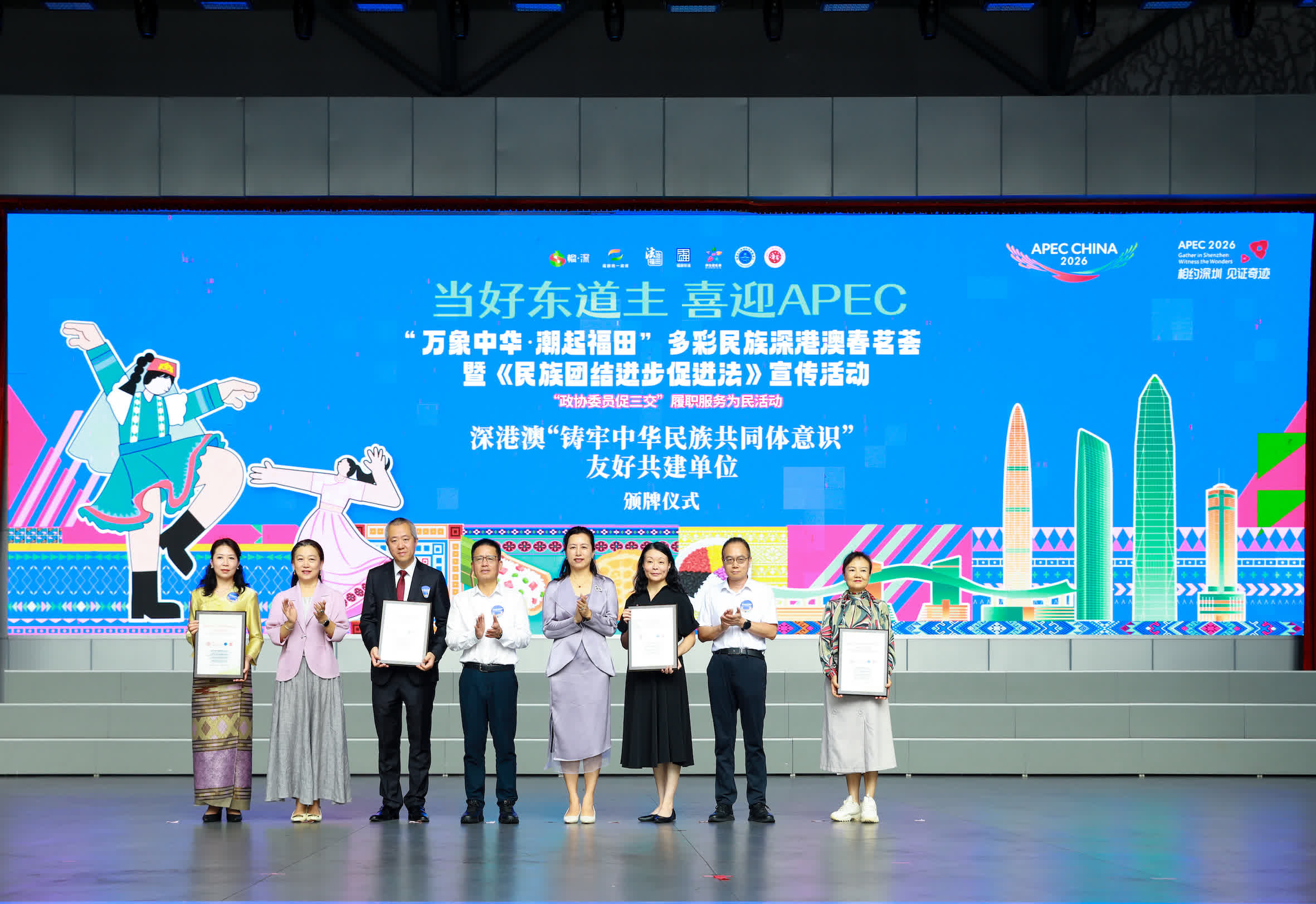值此APEC會議將於深圳福田舉辦之際,深圳福田區正全力推進「國際化建設年」,致力於以APEC為窗口,向世界展示中華優秀傳統文化。本次活動期間,香港中華民族團結進步協會、(澳門)中華民族團結促進會、深圳市民族團結髮展促進會及福田區民族團結進步協會四方,正式結為深港澳「鑄牢中華民族共同體意識」友好共建單位,標誌着相關工作從以往的單點城市探索,正式邁向深港澳區域協同、集群聯動的新階段。
