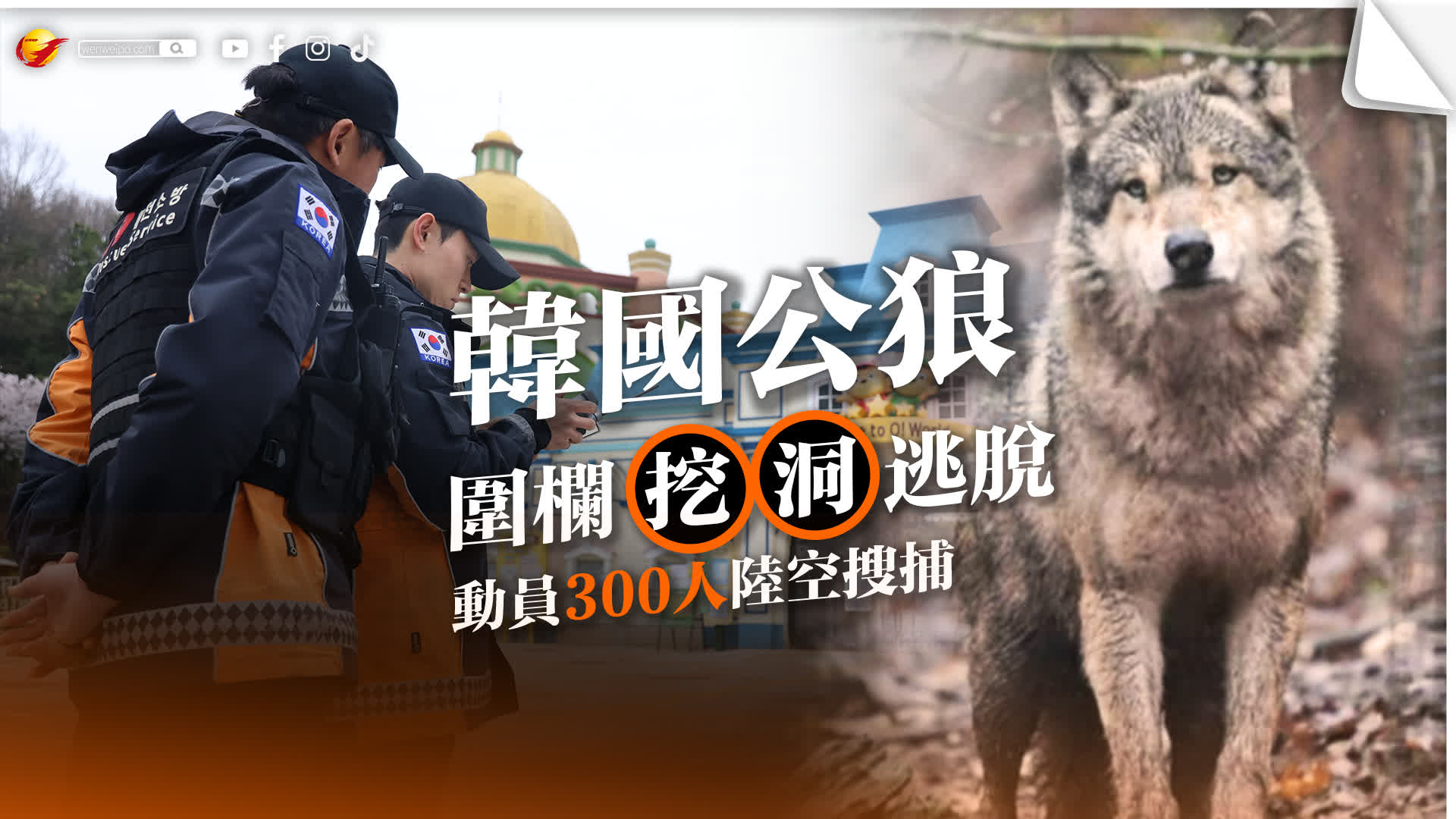 韓國大田O-World動物園表示,年約兩歲、體重約30公斤的公狼「勒古」疑似對圍欄下方土壤挖洞,8日上午成功出走,至今行蹤不明。當局已出動超過300名消防員、警察及軍方人員展開陸空搜尋行動,並設置22個陷阱進行圍捕,目前仍以活捉為目標。