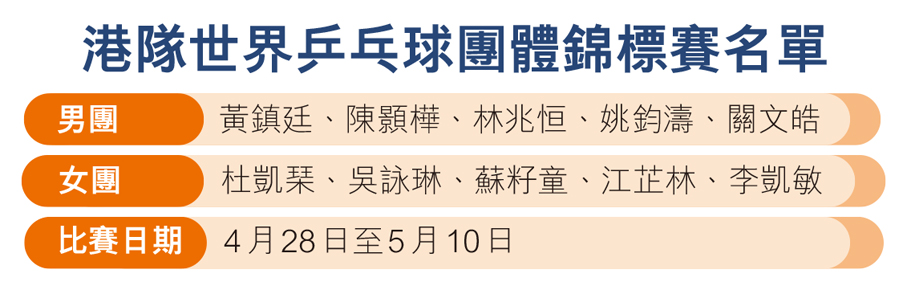 男團方面,近年與黃鎮廷合作男雙、排名曾登頂「世一」的陳顥樺,憶起兩年前因失分導致球隊與獎牌失之交臂,直言是刻骨銘心的遺憾。「上屆世錦賽是關乎奧運資格,廷哥打得很好,一場都沒有輸,但我在關鍵的第三場失分,大比數領先下被人追回、又在賽點的情況下輸,印象真的很深刻,還有很大的遺憾。」汲取過去經驗,他直言今次目標是打好比賽,為球隊作出貢獻,「我不想令隊友和教練失望,最重要是做好自己,發揮實力。」這位21歲主力表示目標是助隊伍先打入八強,更希望能衝擊獎牌,爭取繼2008年後再次踏上世錦賽頒獎台。