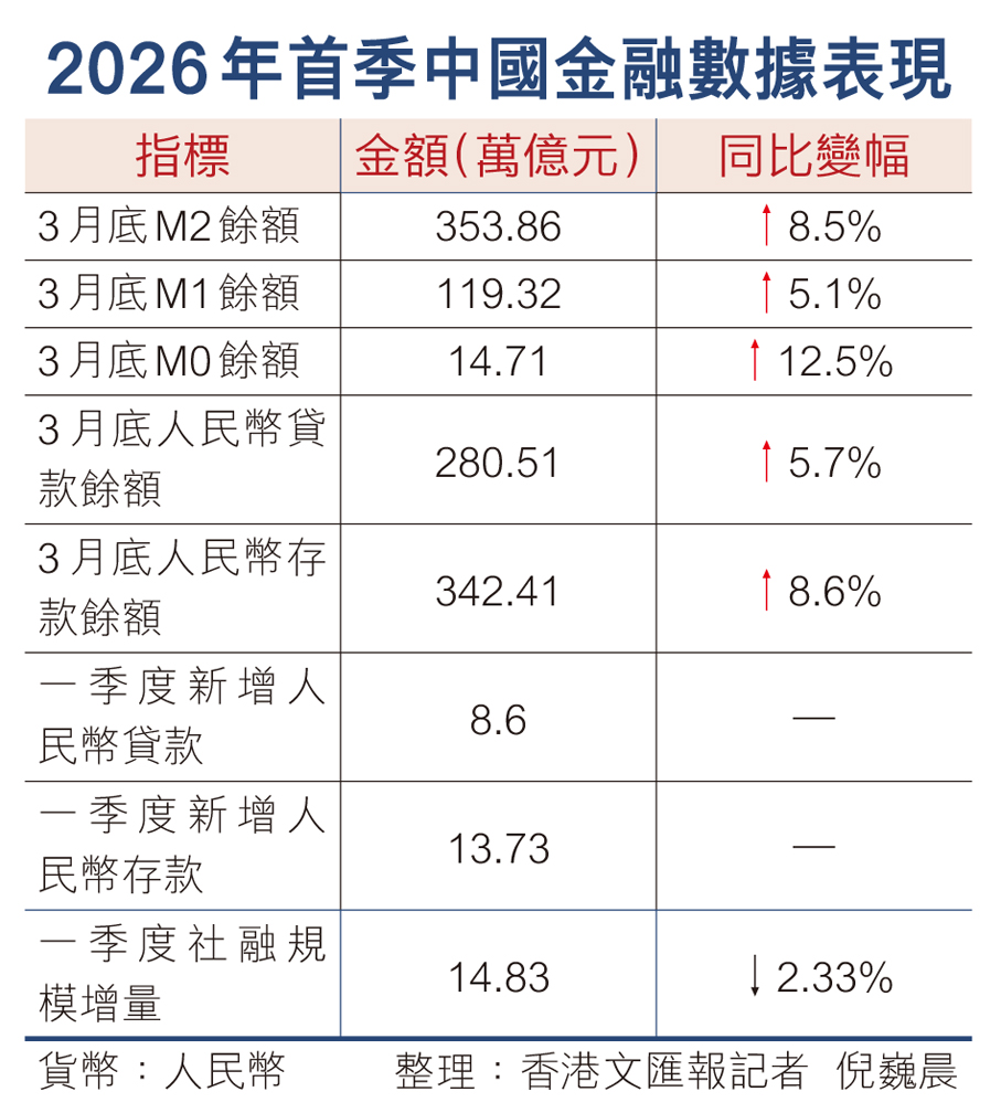 上月內地信貸投放節奏有所加快。中國人民銀行昨發布數據顯示,第一季人民幣貸款增加8.6萬億元(人民幣,下同),社融規模增量累計14.83萬億元,較上年同期少3,545億元或2.33%;據前值估算,3月人民幣貸款增加2.99萬億元,社融規模增加5.23萬億元,均略低於市場預期。分析稱,首季金融總量保持穩健,金融數據結構呈現「政府穩、企業強、居民修復」的特點,尤其是企業融資較為強勁,為第二季經濟平穩增長奠定基礎。市場專家預期,第二季人行料保持流動性合理充裕,推動社融規模、貨幣供應量增長,與經濟增長、價格水平預期目標等相匹配。