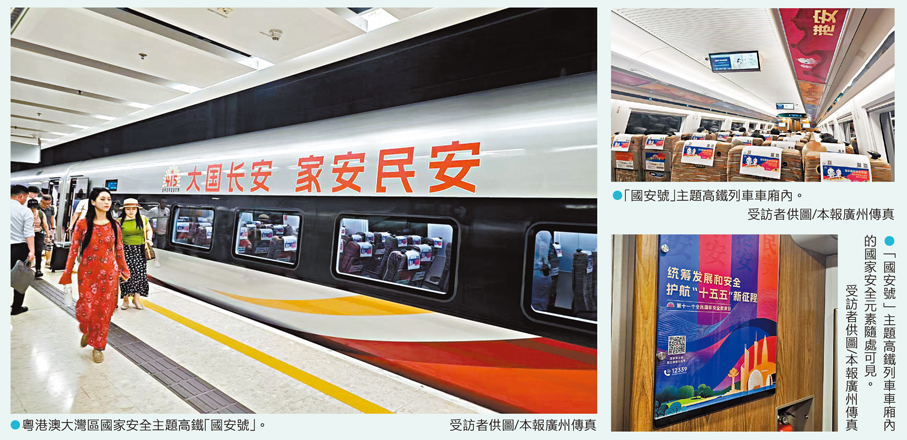 隨着旅客們登上「廣州南—香港西九龍」的G6539次粵港澳大灣區「國安號」主題高鐵列車,他們發現車廂內國家安全教育元素在顯示屏、小桌板、行李架等位置隨處可見。
