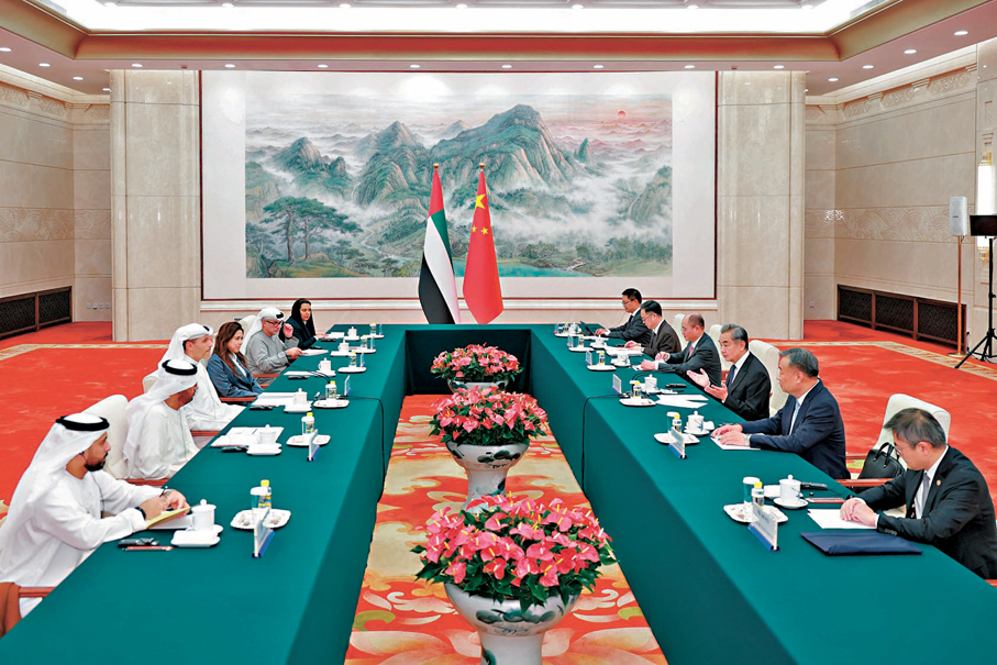 中共中央政治局委員、中央外辦主任王毅13日在京會見陪同阿聯酋阿布扎比王儲哈立德訪華的阿總統中國事務特使哈勒敦。