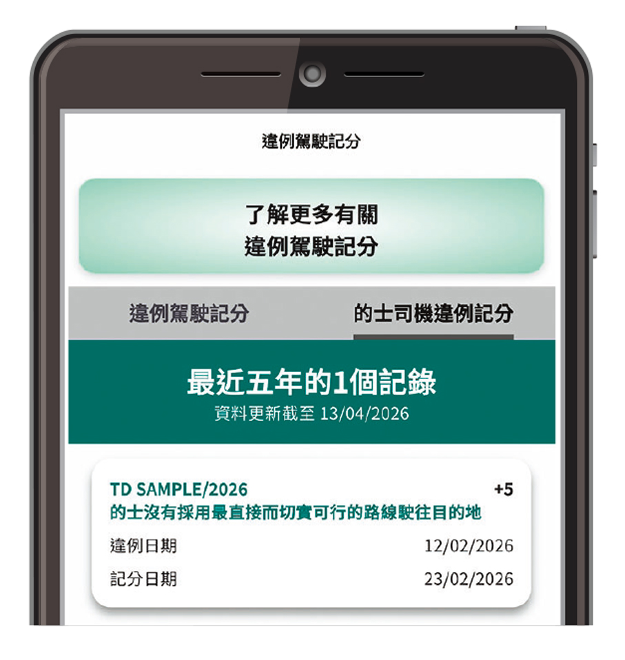 香港文匯報訊 運輸署表示,「電子駕駛執照」手機應用程式由昨日起加入新功能,駕駛人士可以查閱自己的違例駕駛記分紀錄。駕照持有人現在可以點擊手機程式底部新增的「違例駕駛記分」功能,隨時查閱5年內的違例駕駛記分紀錄,包括的士司機的違例記分紀錄。