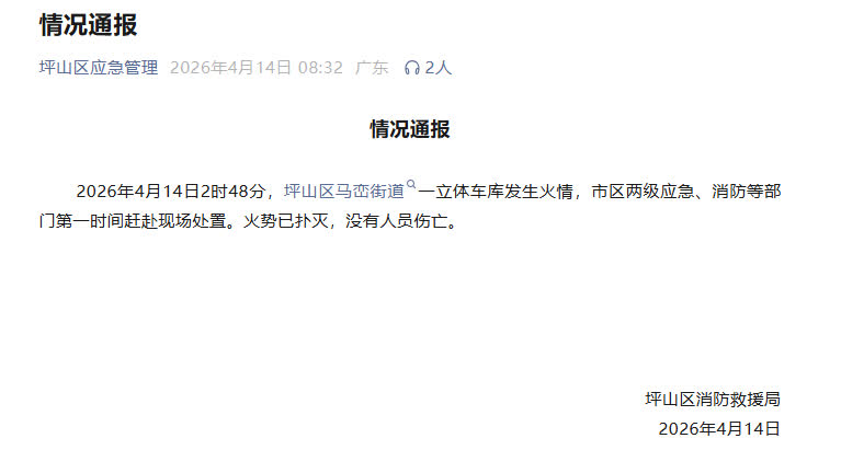 4月14日,坪山區消防救援局發布情況通報。通報中稱,2026年4月14日2時48分,坪山區馬巒街道一立體車庫發生火情,市區兩級應急、消防等部門第一時間趕赴現場處置。火勢已撲滅,沒有人員傷亡。