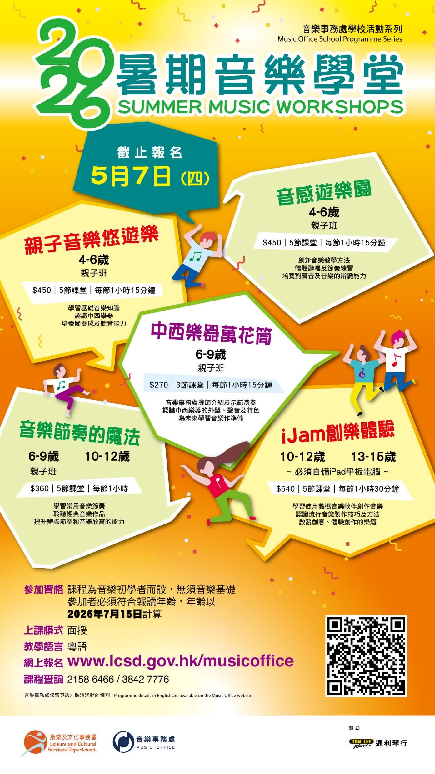 以上所有課程以粵語授課,如有超額申請,將以抽籤形式處理;若個別課堂於首輪報名後仍有餘額,則於6月25日起以先到先得形式接受親身報名。出席率達八成的學員將獲頒修業證書。有興趣參加的人士,可登入音樂事務處網頁(www.lcsd.gov.hk/tc/mo/activities/schoolprogrammes/summer_music_workshops.html)報名。查詢請致電2158 6466/3842 7776。