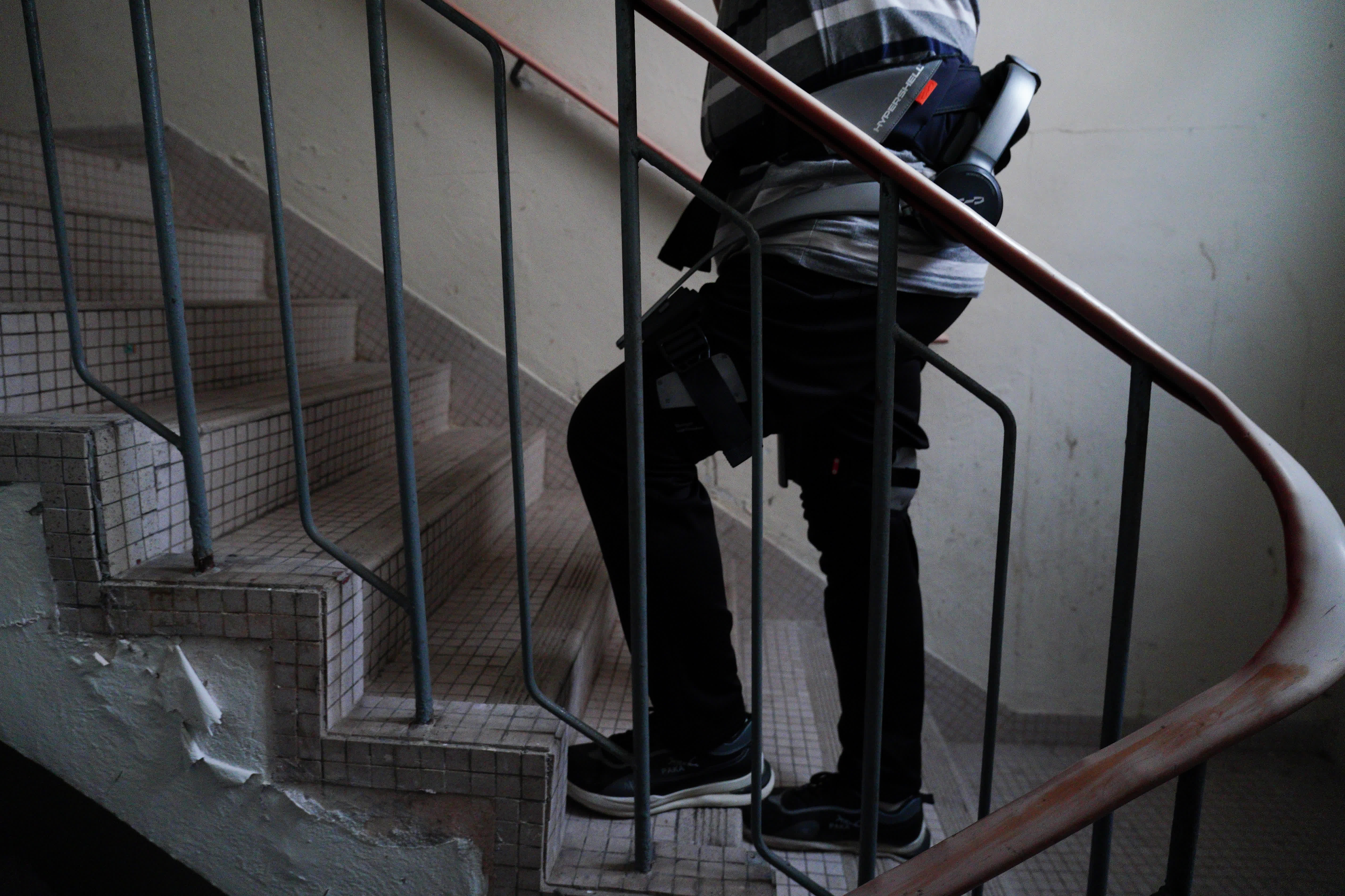 住在宏仁閣25樓的66歲居民Ming今日測試合格,他穿戴裝備進行直路行走、爬升樓梯等測試,結束後指「體驗尚可」,認為該裝備有助於爬樓,直言「會輕鬆點,尤其是高樓居民」。Ming計劃回屋當日幫自己和太太借兩部裝備,最想拿回「郵票、書籍、紀念相片及舊錢幣」。