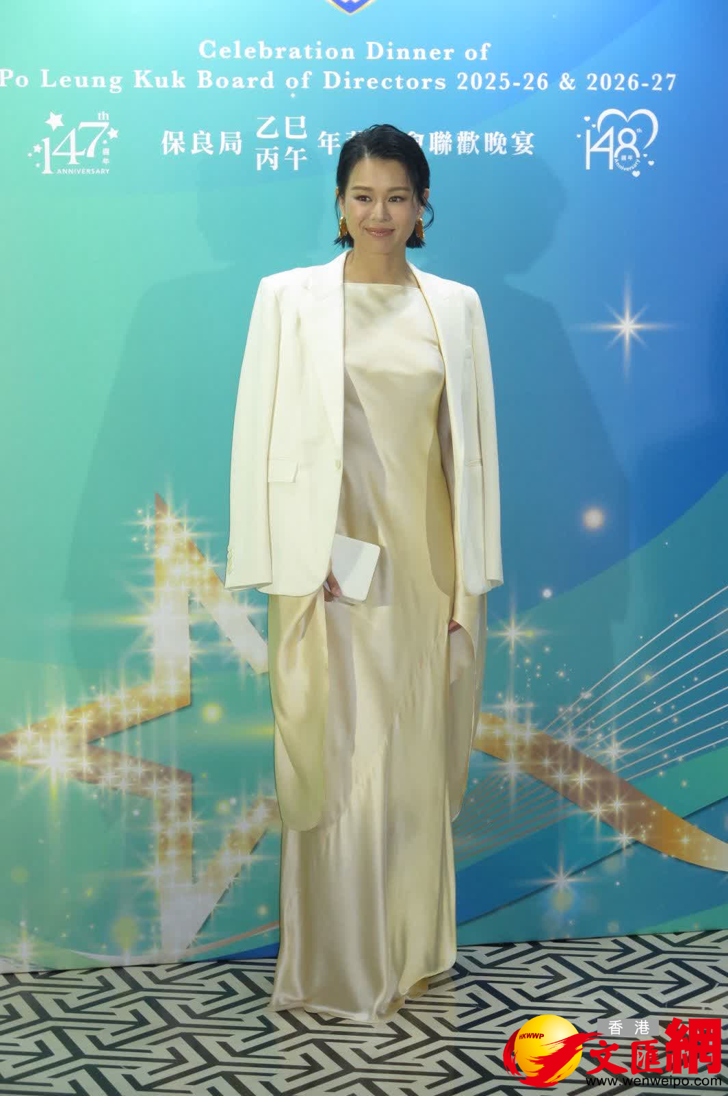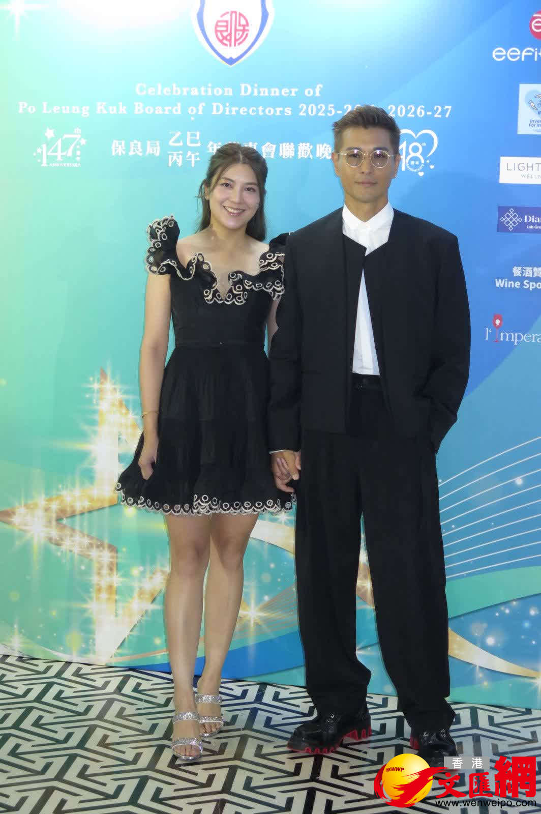 陳百祥與黃杏秀、陳展鵬與太太單文柔、胡杏兒、吳若希等昨晚出席保良局聯歡晚宴。胡杏兒拍照時老公李乘德已急步入會場,她拍照後未留下接受訪問。