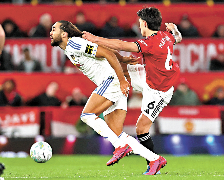 香港文匯報訊(記者 張發兒)香港時間昨日(14日)凌晨上演的英超「玫瑰打吡」,下半場有中堅利辛度馬天尼斯領紅的曼聯,在主場以1:2不敵列斯聯,45年來首次主場不敵對手。今場比賽於56分鐘出現爭議紅牌,馬天尼斯與卡維特利雲於中圈爭波互有動作,前者拉扯到對手頭髮,經VAR介入後判定為「暴力行為」,直紅離場。曼聯隊長般奴費南迪斯賽後對球證判決感到不滿,「球例演繹每次都不同,但我不能再討論球證,再談論可能會引來大麻煩。」卡域克賽後亦表示:「紅牌判決令人驚訝,我們已經連續兩場遇上不利判決,而這次史上最差決定之一。」