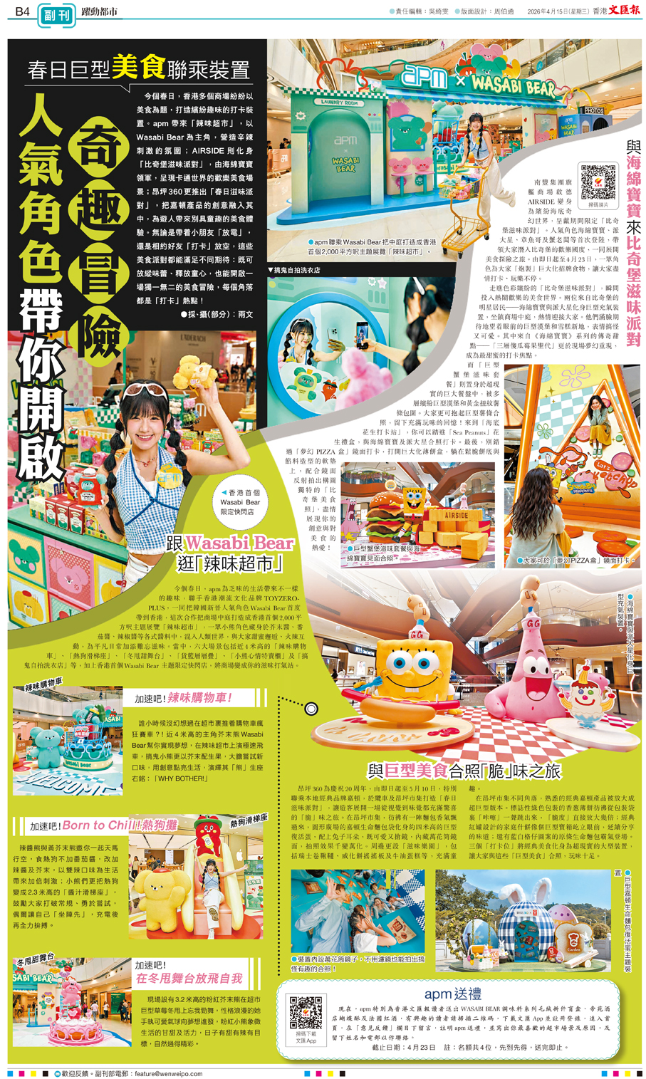 今個春日,apm為乏味的生活帶來不一樣的趣味,聯手香港潮流文化品牌TOYZEROPLUS,一同把韓國新晉人氣角色Wasabi Bear首度帶到香港,這次合作把商場中庭打造成香港首個2,000平方呎主題展覽「辣味超市」,一眾小熊角色藏身於芥末醬、番茄醬、辣椒醬等各式醬料中,混入人類世界,與大家甜蜜邂逅、火辣互動,為平凡日常加添難忘滋味。當中,六大場景包括近4米高的「辣味購物車」、「熱狗滑梯座」、「冬甩甜舞台」、「貨籃層層疊」、「小熊心情特賣櫃」及「搞鬼自拍洗衣店」等,加上香港首個Wasabi Bear 主題限定快閃店,將商場變成你的滋味打氣站。