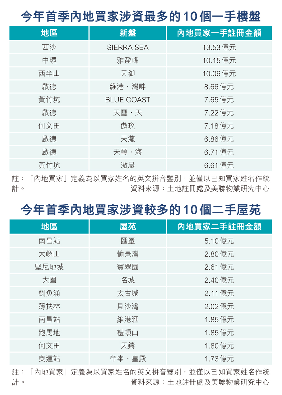 一手方面,岑頌謙稱,今年首季內地買家涉及金額最多的新盤項目為西沙「SIERRA SEA」(約13.53億元);其次為中環「雅盈峰」(約10.15億元);排名第三的是西半山「天御」(約10.06億元)。今年首季內地買家一手涉資金額最高的十大新盤中,啟德區佔4個,包括「維港·灣畔」(約8.66億元)、「天璽·天」(約7.22億元)、「天瀧」(約6.86億元)、「天璽·海」(約6.71億元),印證啟德新盤深受內地資金追捧。