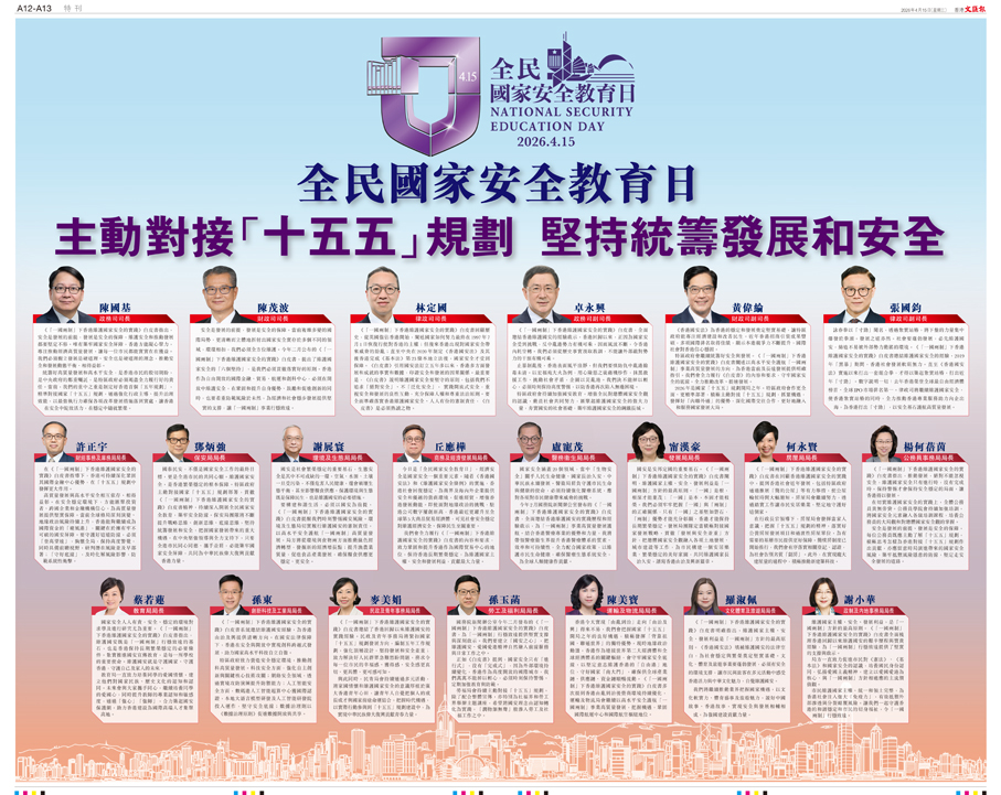 國泰民安,不僅是國家安全工作的最終目標,更是全港市民的共同心願。維護國家安全,是香港繁榮穩定的根本保障。特區政府主動對接國家「十五五」規劃部署,貫徹《「一國兩制」下香港維護國家安全的實踐》白皮書精神,持續深入開展全民國家安全教育,築牢安全防線。保安局團隊將不斷提升戰略思維、創新思維、底線思維,堅持統籌發展和安全,把握國家發展帶來的重大機遇。在中央堅強領導與全力支持下,只要全港市民同心同德、攜手並肩,必能築牢國家安全屏障,共同為中華民族偉大復興貢獻香港力量。