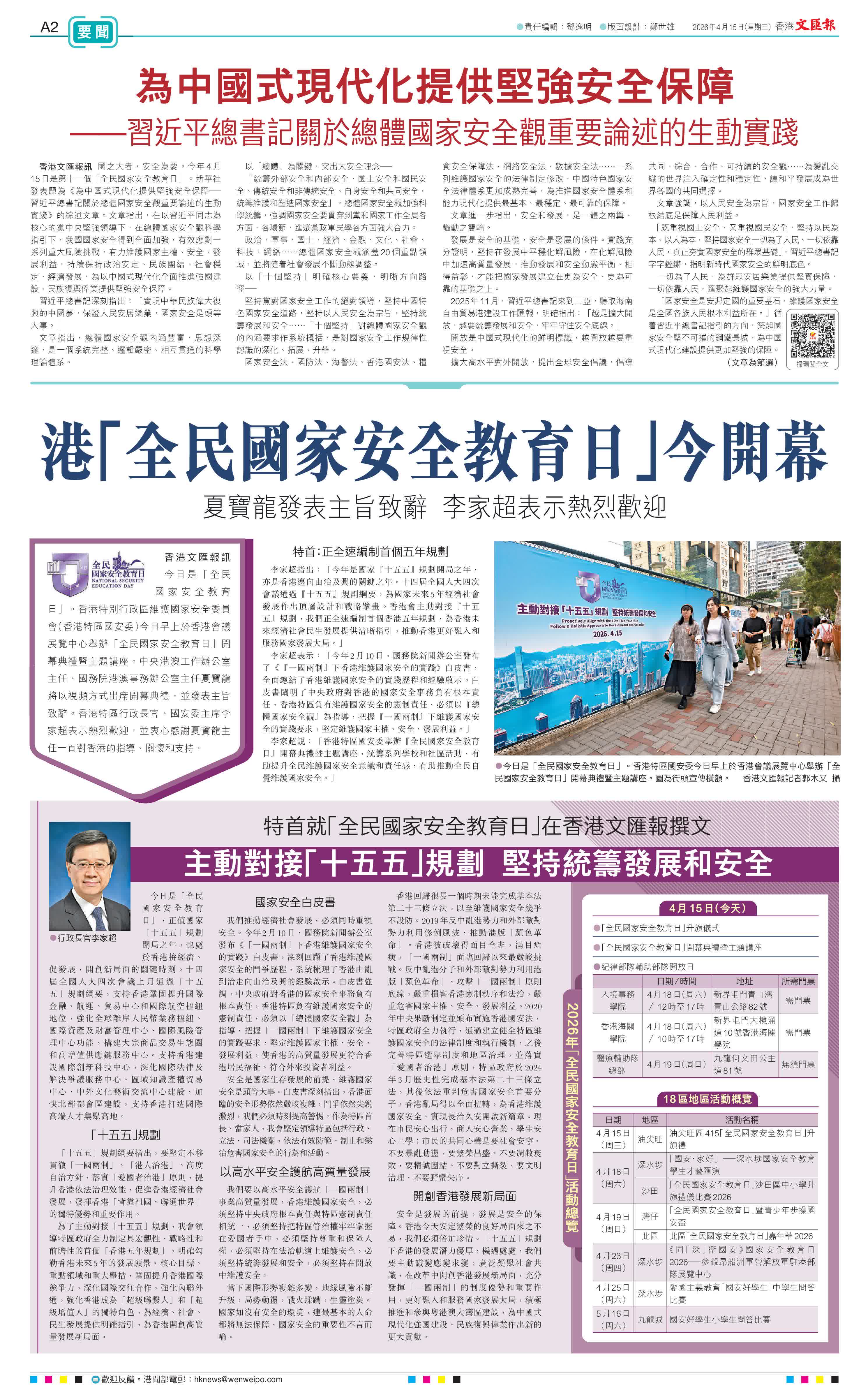 香港文匯報訊 今日是「全民國家安全教育日」。香港特別行政區維護國家安全委員會(香港特區國安委)今日早上於香港會議展覽中心舉辦「全民國家安全教育日」開幕典禮暨主題講座。中央港澳工作辦公室主任、國務院港澳事務辦公室主任夏寶龍將以視頻方式出席開幕典禮,並發表致辭。香港特區行政長官、國安委主席李家超表示熱烈歡迎,並衷心感謝夏寶龍主任一直對香港的指導、關懷和支持。