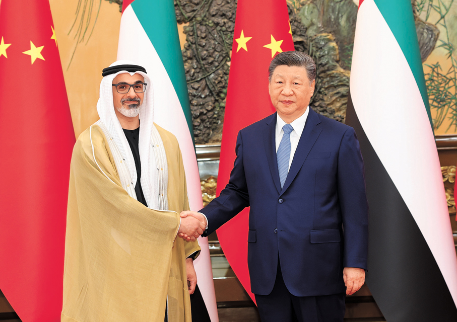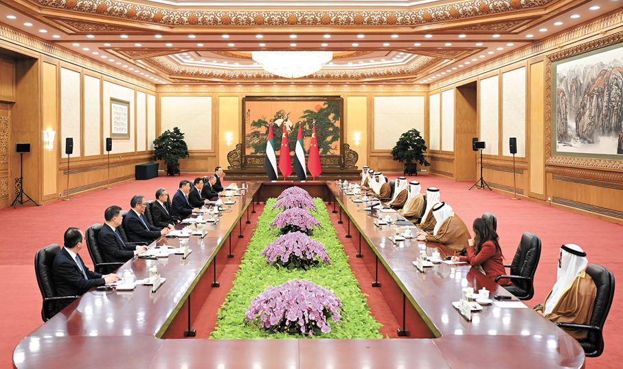 習近平指出,阿聯酋是中國的全面戰略夥伴,中方始終高度重視發展同阿聯酋的關係。在雙方共同努力下,中阿關係保持健康穩定發展,政治互信不斷加深,務實合作穩步推進,人文交流豐富多彩。鞏固和提升中阿關係是雙方的堅定共識,符合兩國人民期待。中方願同阿方攜手同行,打造更加穩固堅韌、富有活力的中阿全面戰略夥伴關係。雙方要繼續在涉及彼此核心利益和重大關切問題上相互支持,保持高層交往,築牢戰略互信。加強發展戰略對接,在能源、投資、貿易、科技等領域深挖潛力,深化互利合作。推動教育、民航、旅遊等合作取得更大進展,密切人文交流,夯實民意基礎。在聯合國、金磚國家等多邊平台增進協調合作,以中阿關係的穩定性應對國際和地區形勢的不確定性,共同推動構建人類命運共同體。