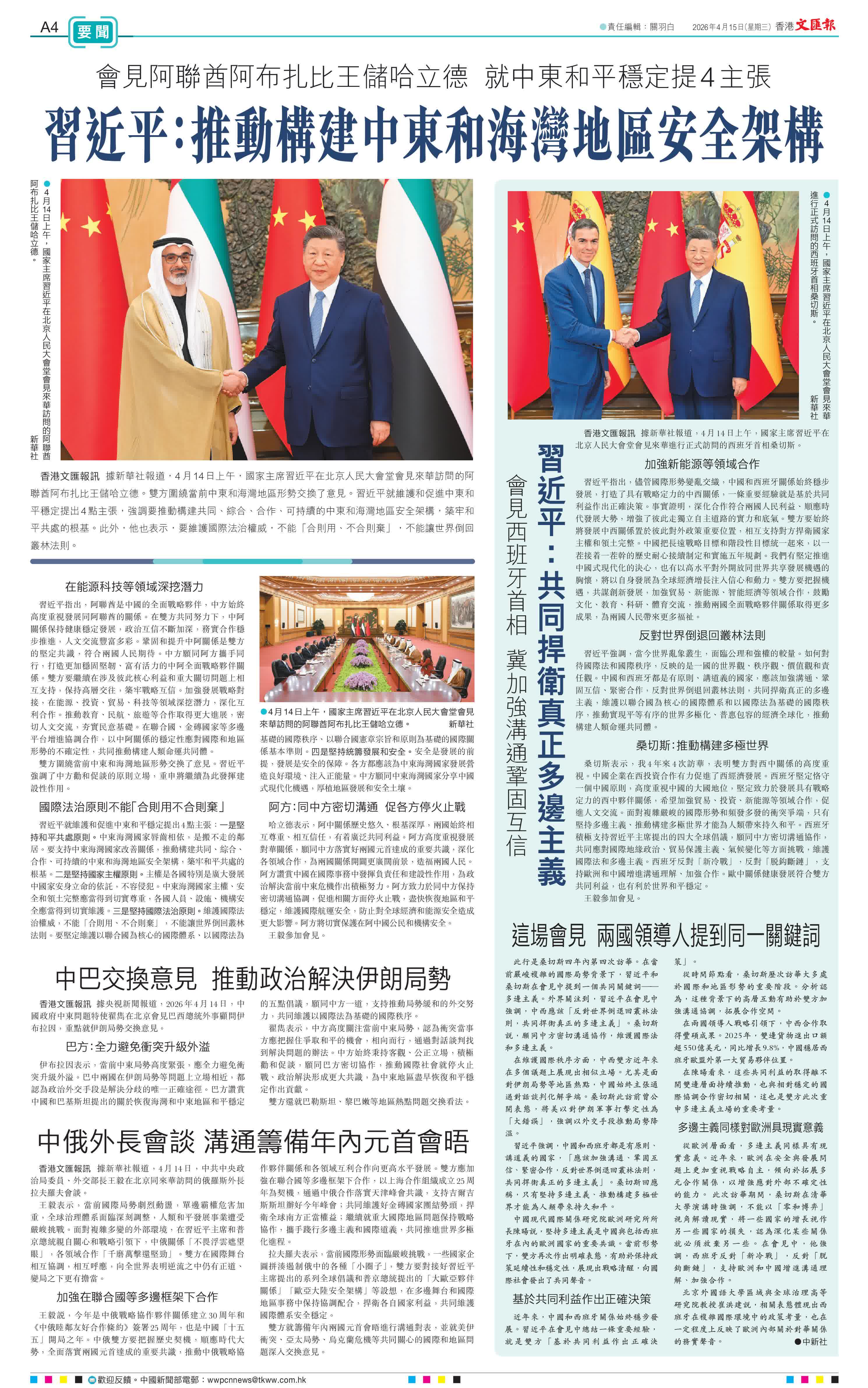 香港文匯報訊 據新華社報道,4月14日上午,國家主席習近平在北京人民大會堂會見來華訪問的阿聯酋阿布扎比王儲哈立德。雙方圍繞當前中東和海灣地區形勢交換了意見。習近平就維護和促進中東和平穩定提出4點主張,強調要推動構建共同、綜合、合作、可持續的中東和海灣地區安全架構,築牢和平共處的根基。此外,他也表示,要維護國際法治權威,不能「合則用、不合則棄」,不能讓世界倒回叢林法則。
