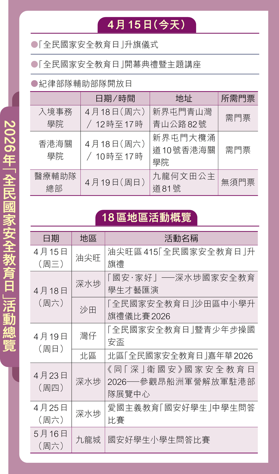 今日是「全民國家安全教育日」,正值國家「十五五」規劃開局之年,也處於香港拚經濟、促發展,開創新局面的關鍵時刻。十四屆全國人大四次會議上月通過「十五五」規劃綱要,支持香港鞏固提升國際金融、航運、貿易中心和國際航空樞紐地位,強化全球離岸人民幣業務樞紐、國際資產及財富管理中心、國際風險管理中心功能,構建大宗商品交易生態圈和高增值供應鏈服務中心。支持香港建設國際創新科技中心,深化國際法律及解決爭議服務中心、區域知識產權貿易中心、中外文化藝術交流中心建設,加快北部都會區建設,支持香港打造國際高端人才集聚高地。