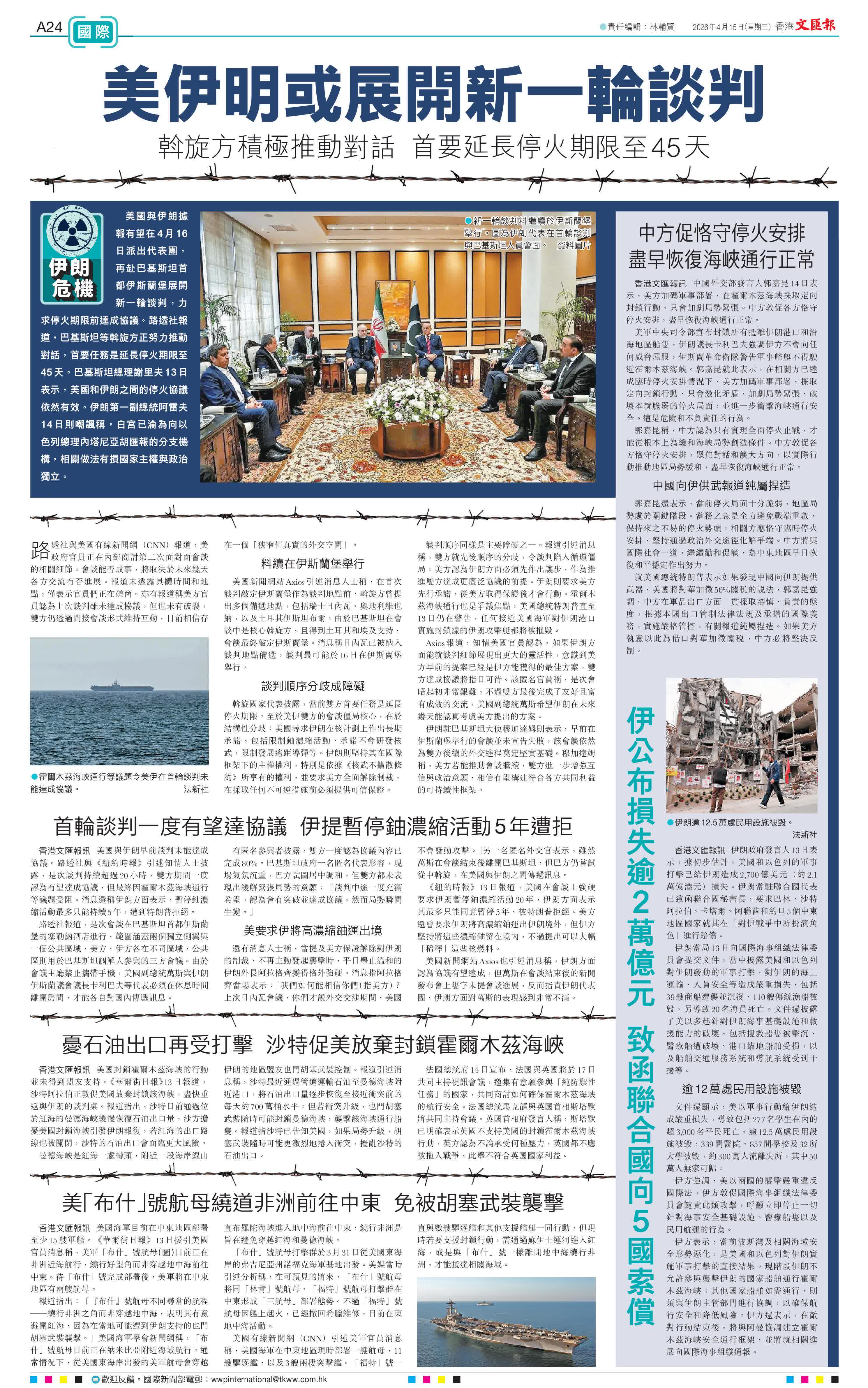 美國與伊朗據報有望在4月16日派出代表團,再赴巴基斯坦首都伊斯蘭堡展開新一輪談判,力求停火期限前達成協議。路透社報道,巴基斯坦等斡旋方正努力推動對話,首要任務是延長停火期限至45天。巴基斯坦總理謝里夫13日表示,美國和伊朗之間的停火協議依然有效。伊朗第一副總統阿雷夫14日則嘲諷稱,白宮已淪為向以色列總理內塔尼亞胡匯報的分支機構,相關做法有損國家主權與政治獨立。