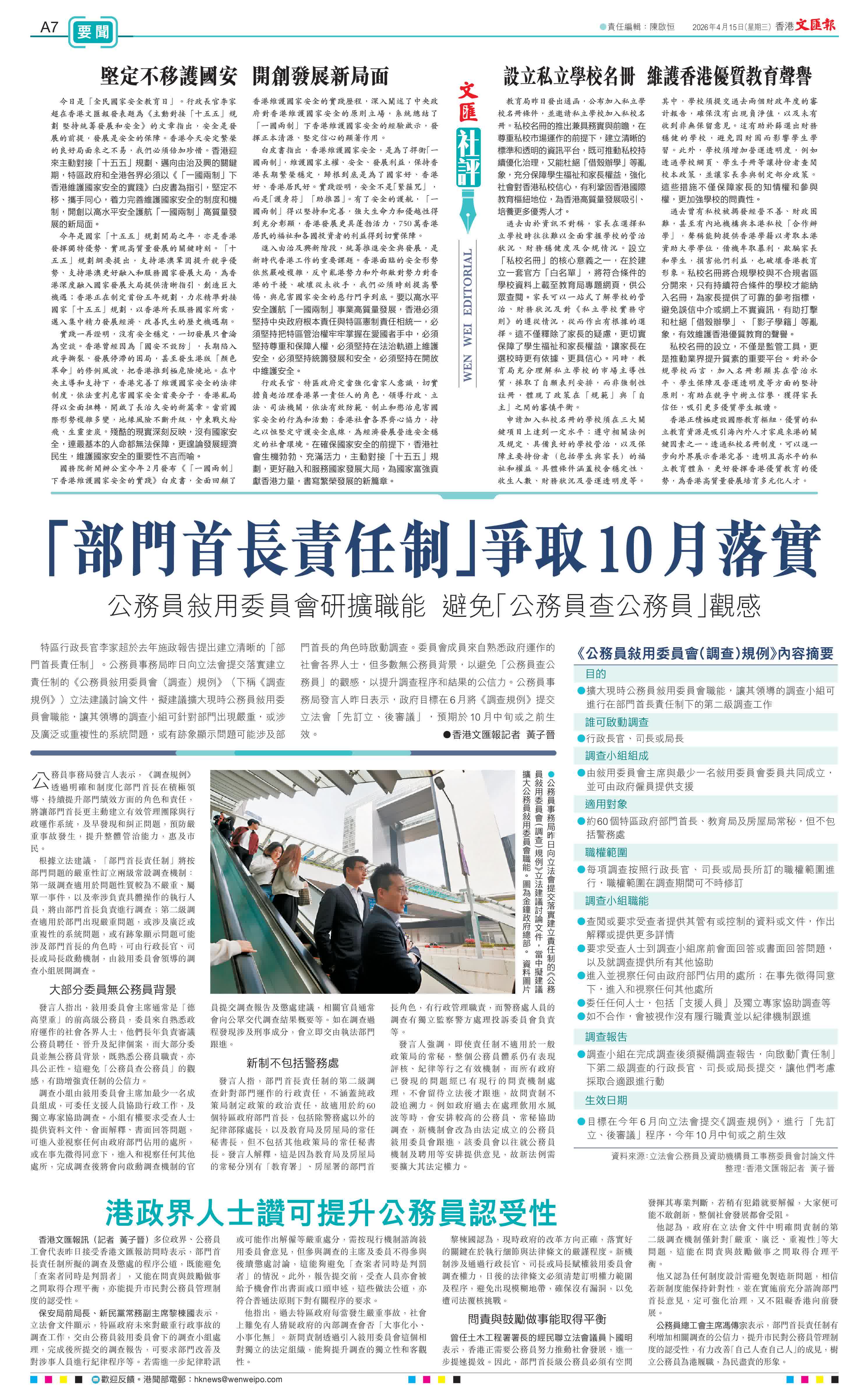 (香港文匯報記者 黃子晉)特區行政長官李家超於去年施政報告提出建立清晰的「部門首長責任制」。公務員事務局昨日向立法會提交落實建立責任制的《公務員敍用委員會(調查)規例》(下稱《調查規例》)立法建議討論文件,擬建議擴大現時公務員敍用委員會職能,讓其領導的調查小組可針對部門出現嚴重,或涉及廣泛或重複性的系統問題,或有跡象顯示問題可能涉及部門首長的角色時啟動調查。委員會成員來自熟悉政府運作的社會各界人士,但多數無公務員背景,以避免「公務員查公務員」的觀感,以提升調查程序和結果的公信力。公務員事務局發言人昨日表示,政府目標在6月將《調查規例》提交立法會「先訂立、後審議」,預期於10月中旬或之前生效。