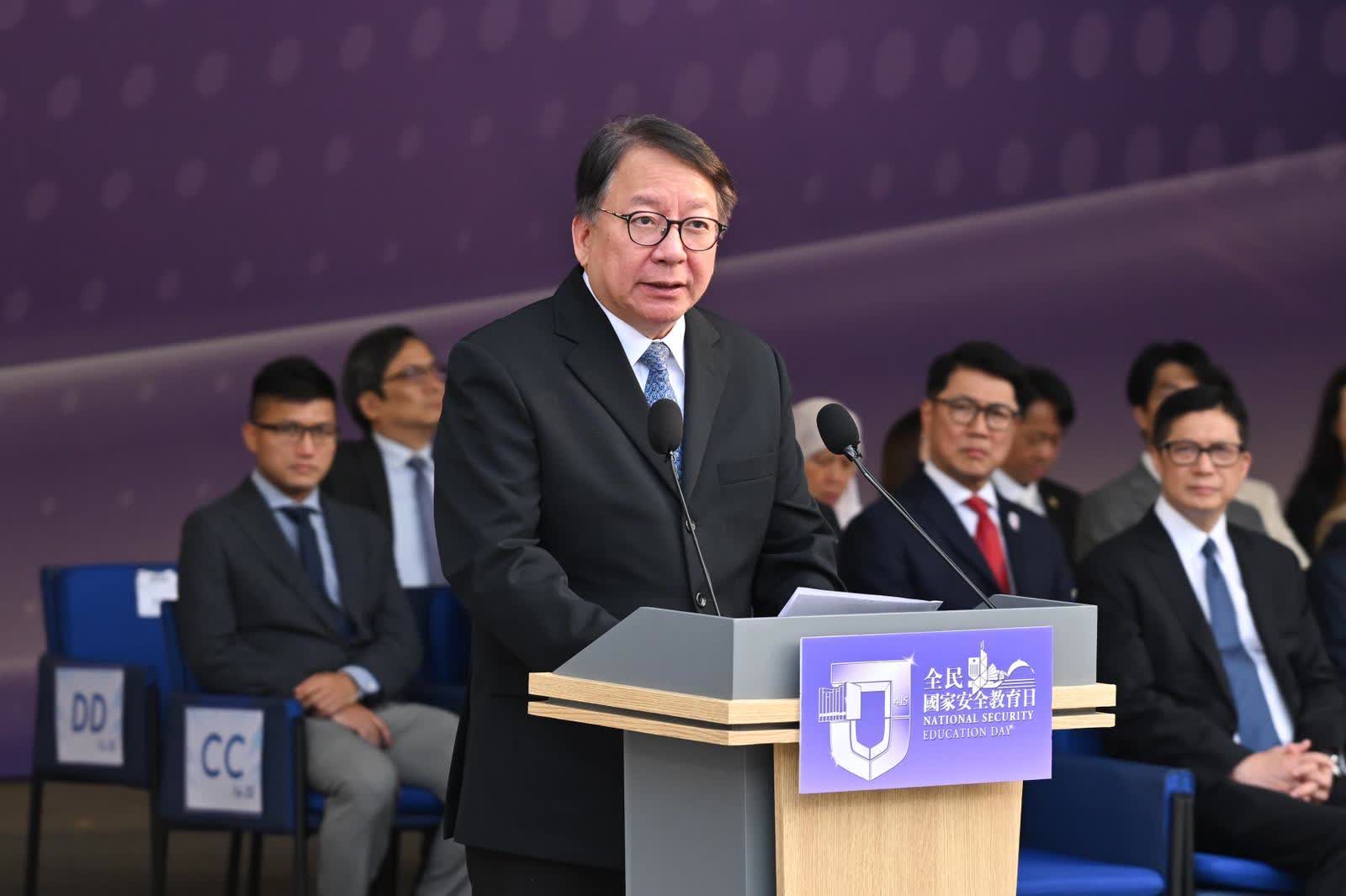 陳國基說,特區政府一直高度重視每年4月15日的「全民國家安全教育日」。國家安全教育從推廣普及,到扎根人心,每一步都來之不易。在特區政府與社會各界同心協力下,總體國家安全觀走進校園、走進社區。全社會維護國家安全的自覺性與使命感,達到了前所未有的高度。他強調:「國家主席習近平多次囑咐我們,推進『一國兩制』實踐,必須堅持維護高水平安全、推動高質量發展。安全是發展的前提,發展是安全的保障,維護安全和推動發展,兩者都要堅定不移,不可偏廢。」