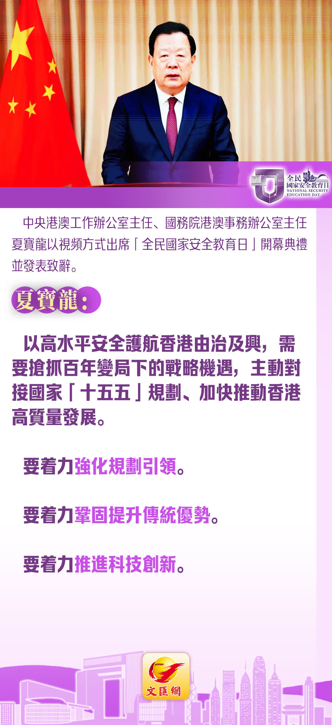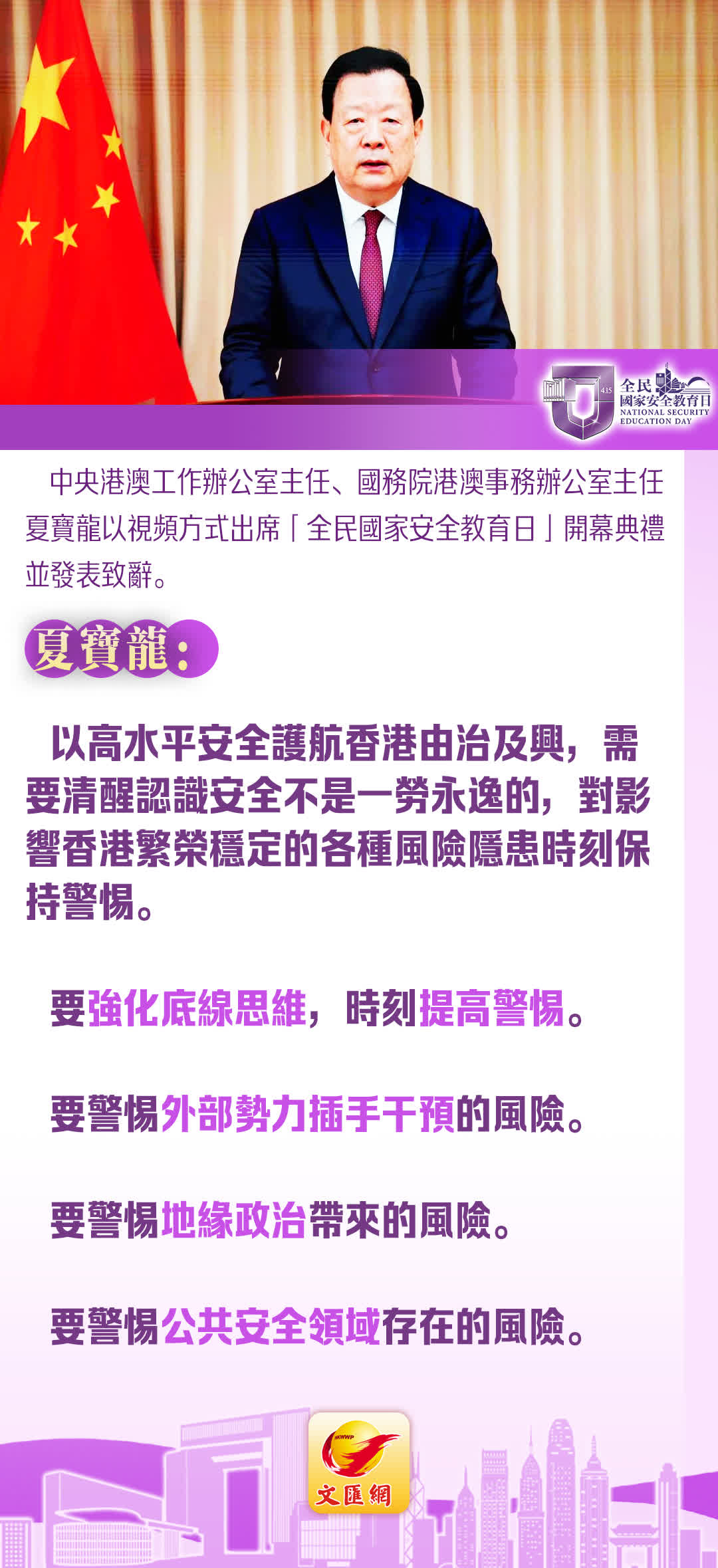 今日(15日),中央港澳工作辦公室主任、國務院港澳事務辦公室主任夏寶龍以視頻方式出席「全民國家安全教育日」開幕典禮並發表致辭。