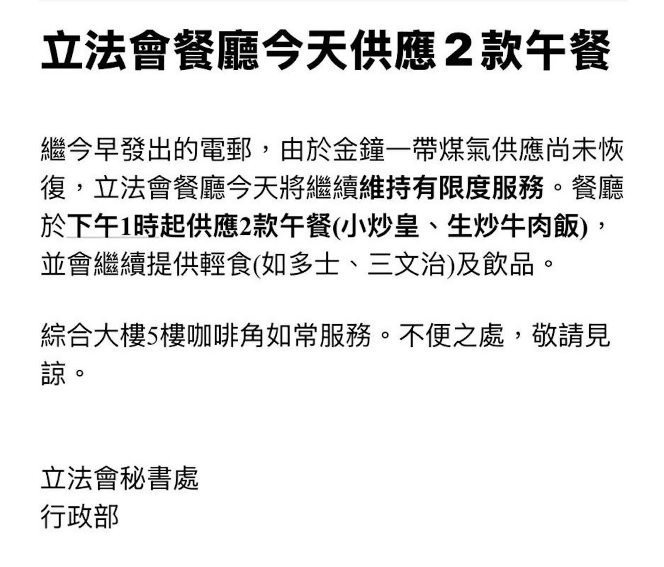 由於事發正值午市時段,有餐廳生意包括立法會大樓的餐廳受影響,立法會秘書處發出通知指,由於金鐘一帶煤氣供應尚未恢復,立法會餐廳今日將繼續維持有限度服務,下午1時起僅提供2款午餐(小炒皇及生炒牛肉飯),但仍會繼續提供多士、三文治及飲品。