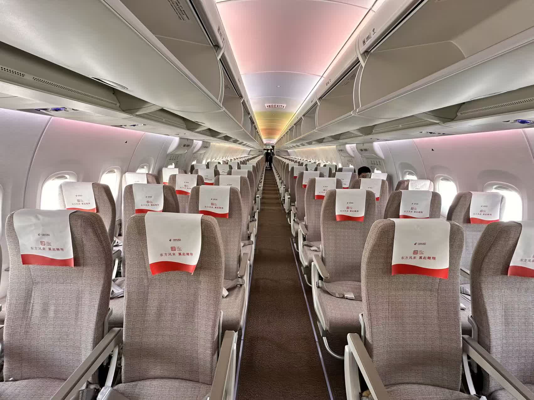 本次首航採用東航最新接收的C919客機,採用8個公務艙+155個經濟艙的兩艙布局,總座位數163個。據介紹,首航客座率達85 %,充分體現了市場對國產大飛機的高度認可。哈爾濱旅客王女士表示,「機艙空間比預期寬敞,行李架容積大,飛行過程非常平穩,能體驗國產大飛機感到十分自豪。」