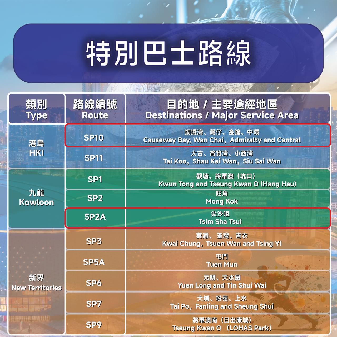- 巴士:設特別巴士路線,於宋王臺道上落客區提供服務