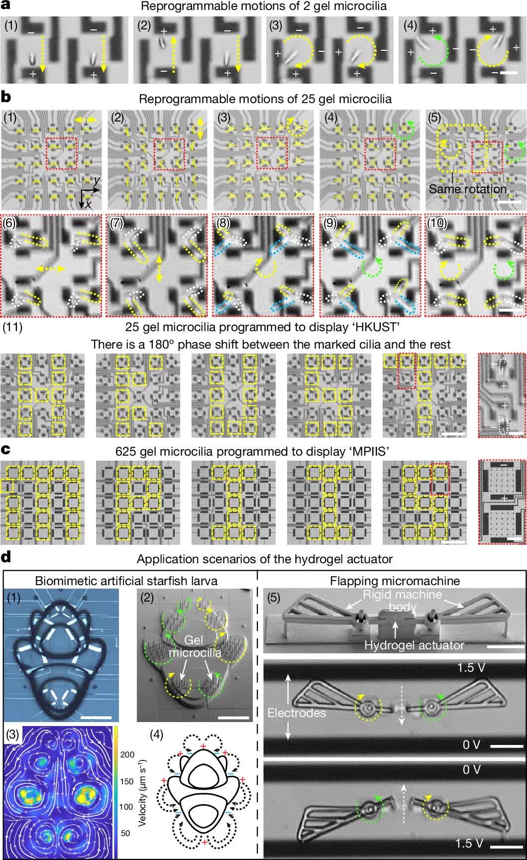 科大亦牽頭與德國斯圖加特馬普智能系統研究所合作,引入對方在微型機械人領域具國際領先水平的專業知識及實驗驗證技術;同時與土耳其科奇大學攜手,充分結合其在物理智能及系統層面整合方面的優勢。透過跨國協作,研究團隊成功製備出可由極低電壓驅動的水凝膠微纖毛,其驅動電壓與一般家用電池相若。當內部帶電粒子在電場作用下移動時,纖毛便可產生可控彎曲;研究人員亦可透過調整輸入電信號,令纖毛展現如生物般複雜的彎曲及旋轉運動。