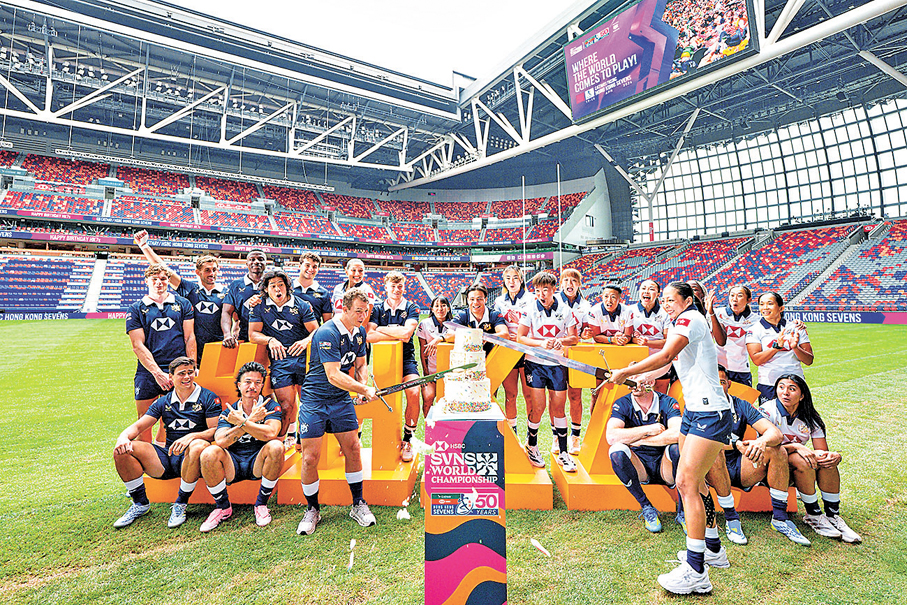 香港文匯報訊 本周末在啟德主場舉行的國泰/滙豐香港國際七人欖球賽將迎來50周年慶典,同時也將展開「滙豐SVNS世界七人欖球系列賽」的全新篇章,各隊隊長齊集啟德,出席賽事50周年「生日派對」,其中港隊隊長陳穎與拜恩塞巴齊手持「銀劍」切蛋糕,為香港七欖「賀壽」。