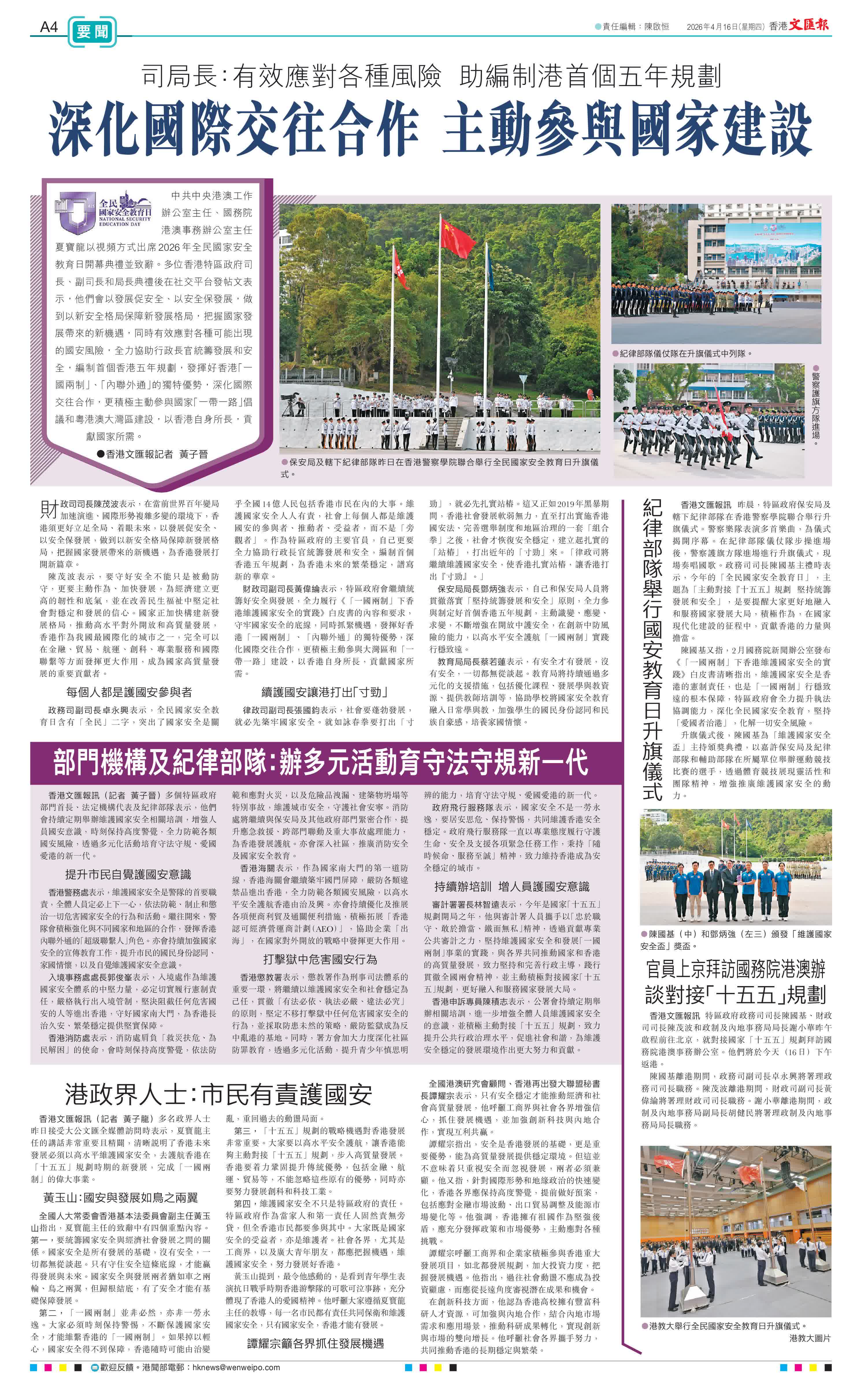 (香港文匯報記者 黃子晉)中共中央港澳工作辦公室主任、國務院港澳事務辦公室主任夏寶龍以視頻方式出席2026年全民國家安全教育日開幕典禮並致辭。多位香港特區政府司長、副司長和局長典禮後在社交平台發帖文表示,他們會以發展促安全、以安全保發展,做到以新安全格局保障新發展格局,把握國家發展帶來的新機遇,同時有效應對各種可能出現的國安風險,全力協助行政長官統籌發展和安全,編制首個香港五年規劃,發揮好香港「一國兩制」、「內聯外通」的獨特優勢,深化國際交往合作,更積極主動參與國家「一帶一路」倡議和粵港澳大灣區建設,以香港自身所長,貢獻國家所需。