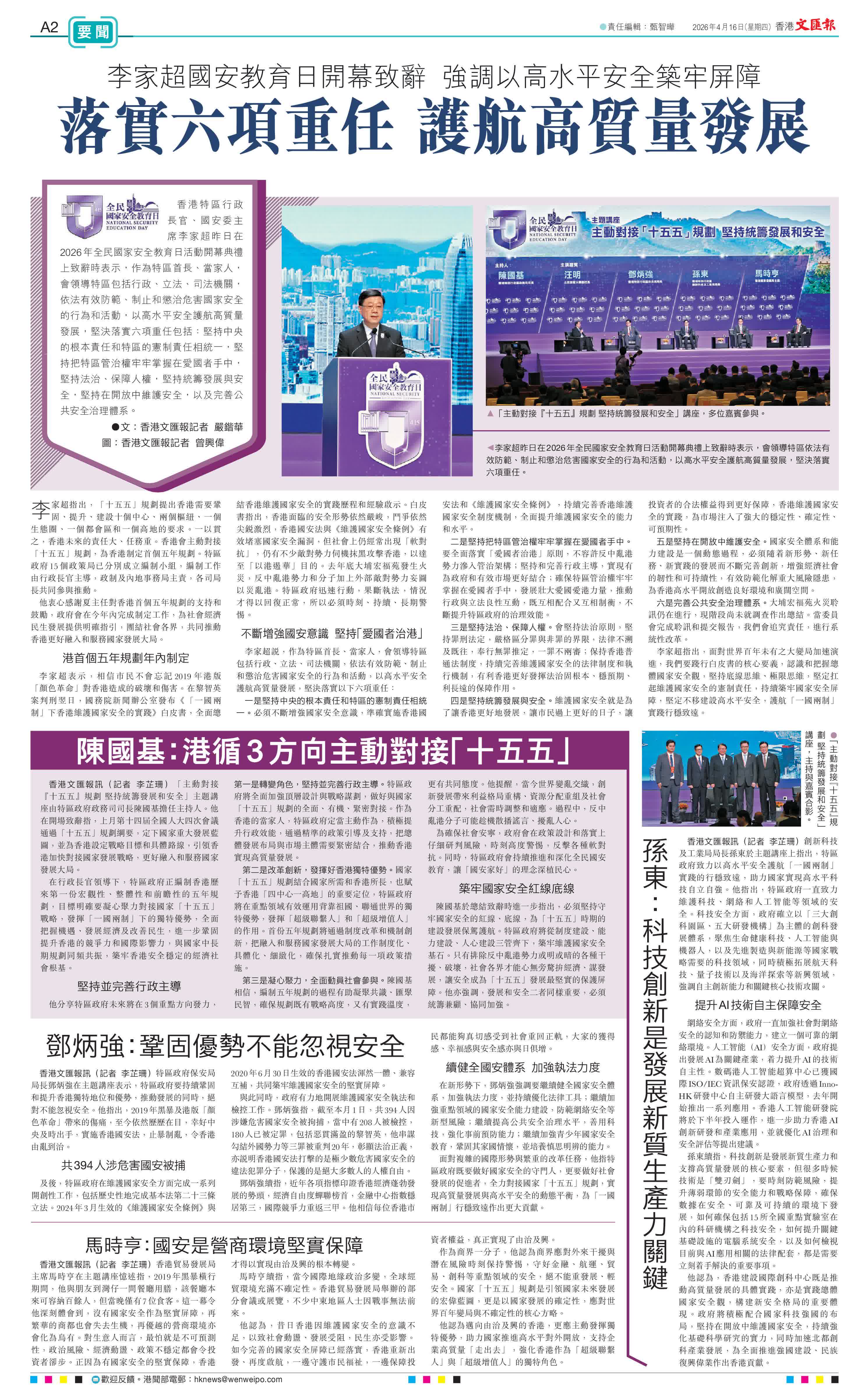 (香港文匯報記者 嚴鍇華)香港特區行政長官、國安委主席李家超昨日在2026年全民國家安全教育日活動開幕典禮上致辭時表示,作為特區首長、當家人,會領導特區包括行政、立法、司法機關,依法有效防範、制止和懲治危害國家安全的行為和活動,以高水平安全護航高質量發展,堅決落實六項重任包括:堅持中央的根本責任和特區的憲制責任相統一,堅持把特區管治權牢牢掌握在愛國者手中,堅持法治、保障人權,堅持統籌發展與安全,堅持在開放中維護安全,以及完善公共安全治理體系。
