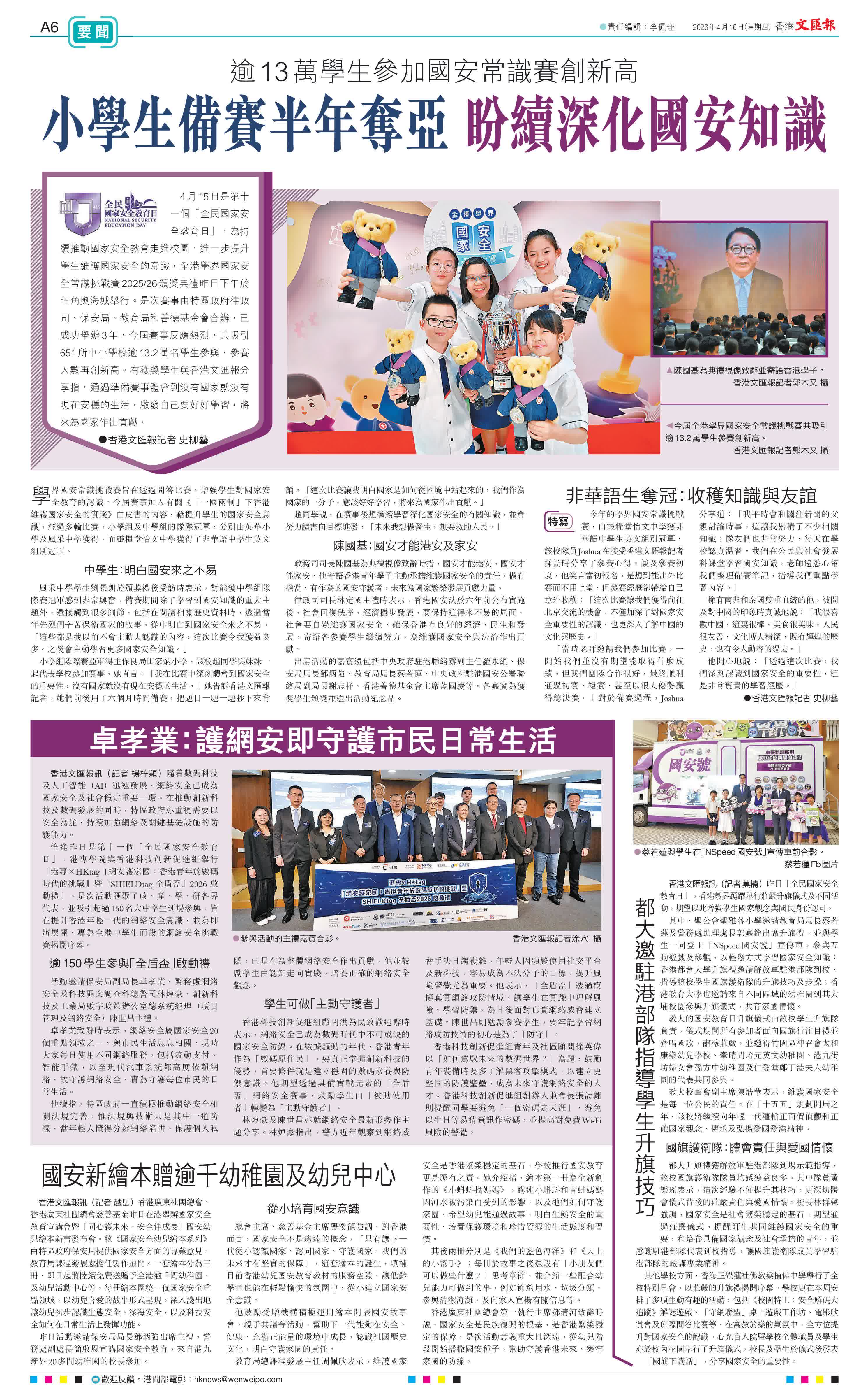 (香港文匯報記者 史柳藝)4月15日是第十一個「全民國家安全教育日」,為持續推動國家安全教育走進校園,進一步提升學生維護國家安全的意識,全港學界國家安全常識挑戰賽2025/26頒獎典禮昨日下午於旺角奧海城舉行。是次賽事由特區政府律政司、保安局、教育局和善德基金會合辦,已成功舉辦3年,今屆賽事反應熱烈,共吸引651所中小學校逾13.2萬名學生參與,參賽人數再創新高。有獲獎學生與香港文匯報分享指,通過準備賽事體會到沒有國家就沒有現在安穩的生活,啟發自己要好好學習,將來為國家作出貢獻。