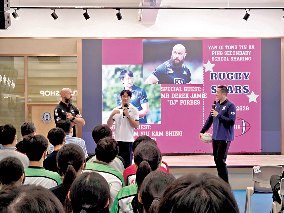 香港文匯報訊 兩名本地體壇名宿姚錦成與唐焯彬,攜手欖球傳奇DJ Forbes日前走進校園,於仁愛堂田家炳中學分享會帶來專業分享與精彩技術演示,為今日展開的香港七欖預熱。