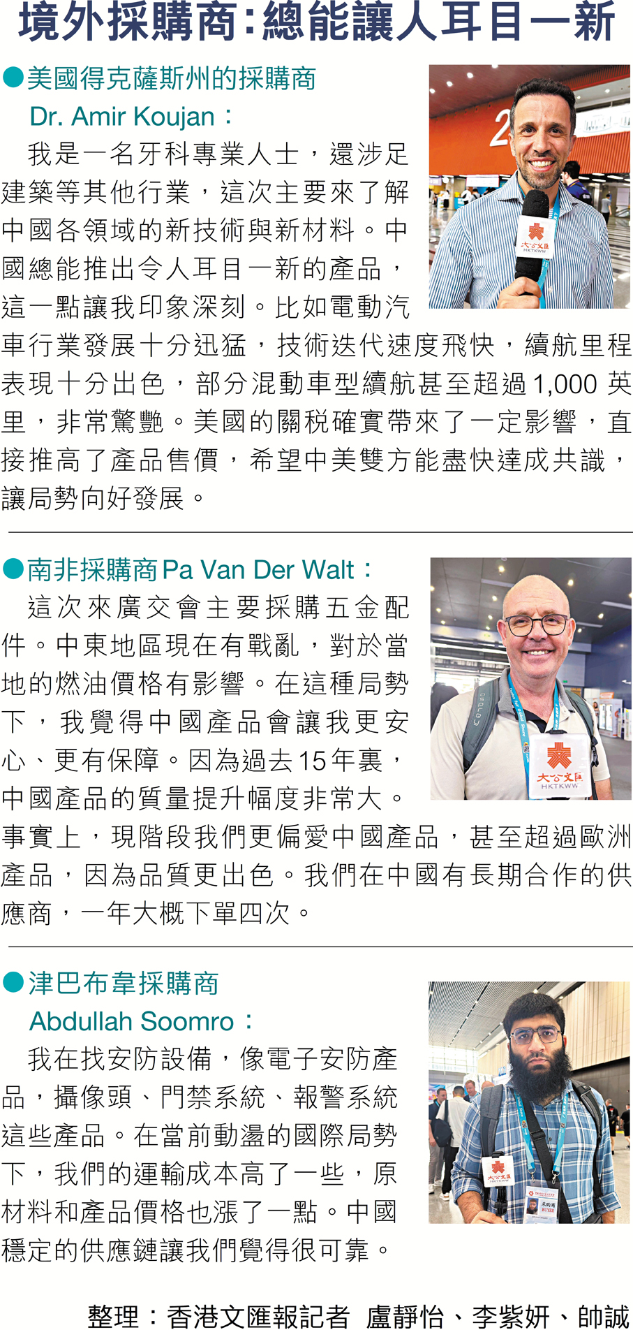 多個不同地區的境外採購商不約而同地告訴香港文匯報記者,當前國際環境不確定性不斷上升,而中國穩定的供應能力與完整的產業體系為他們提供了信心。來自南非的採購商Pa Van Der Walt,已與中國供應商保持了15年的穩定合作,此次專程前來採購五金配件。他表示,當前中東局勢動盪推高了全球燃油價格,也加劇了區域生產和運輸的不確定性,「在這種情況下,中國供應鏈讓我更安心」。他直言,過去十多年間,中國產品的質量提升有目共睹,「現在甚至比部分歐洲產品更具競爭力」,公司每年都會在中國下單約四次。