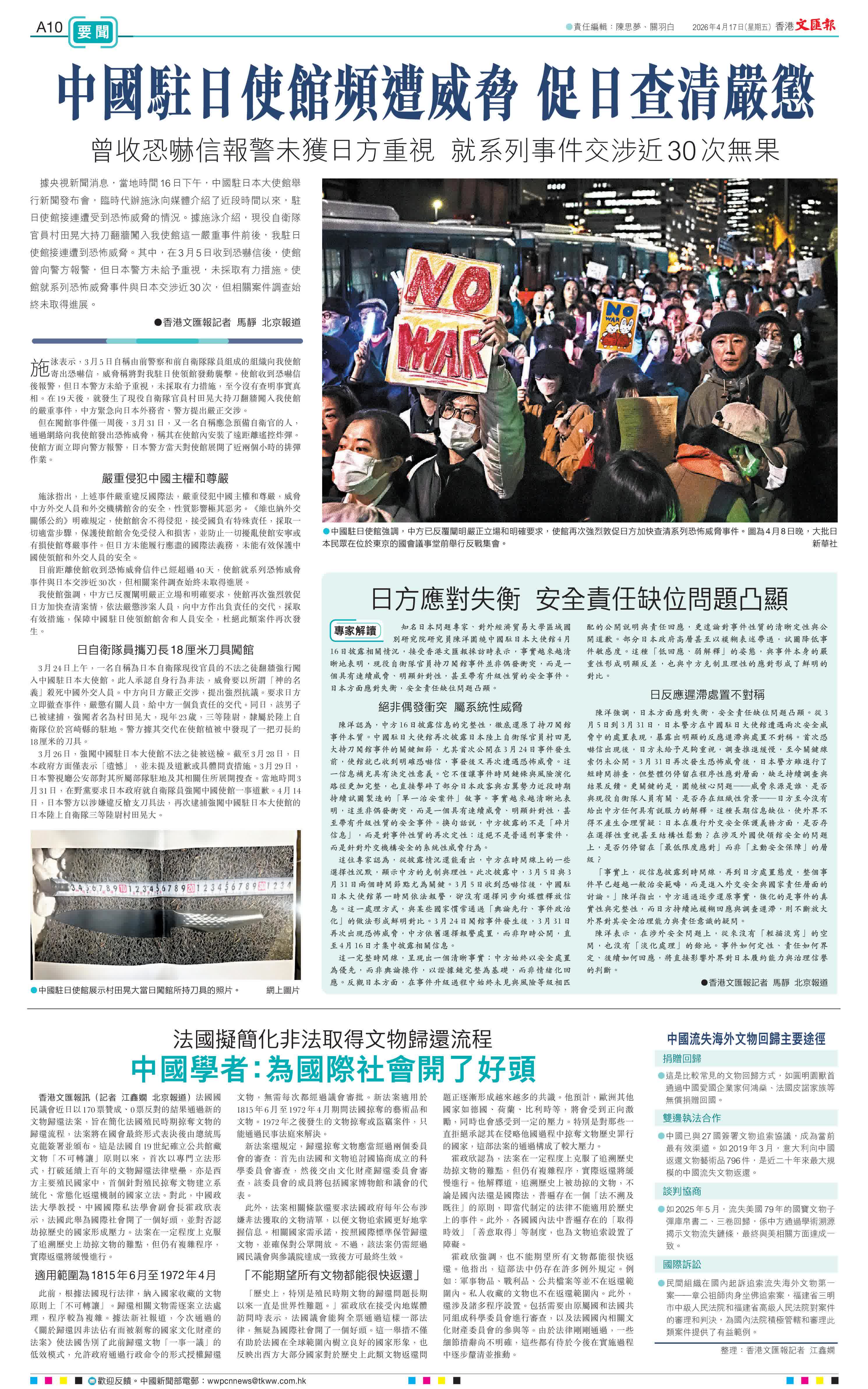 知名日本問題專家、對外經濟貿易大學區域國別研究院研究員陳洋圍繞中國駐日本大使館4月16日披露相關情況,接受香港文匯報採訪時表示,事實越來越清晰地表明,現役自衛隊官員持刀闖館事件並非偶發衝突,而是一個具有連續威脅、明顯針對性,甚至帶有升級性質的安全事件。日本方面應對失衡,安全責任缺位問題凸顯。