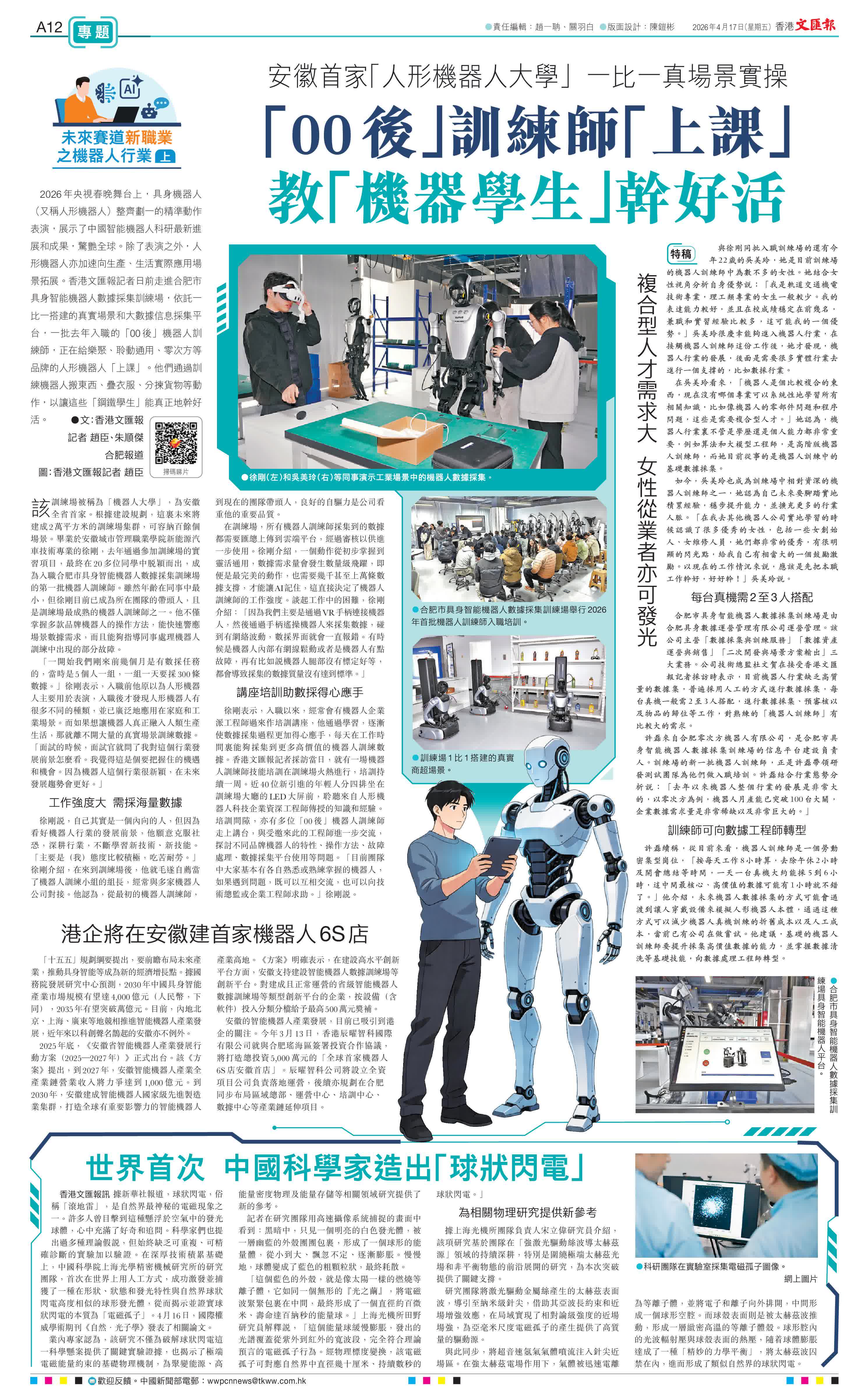 2026年央視春晚舞台上,具身機器人(又稱人形機器人)整齊劃一的精準動作表演,展示了中國智能機器人科研最新進展和成果,驚艷全球。除了表演之外,人形機器人亦加速向生產、生活實際應用場景拓展。香港文匯報記者日前走進合肥市具身智能機器人數據採集訓練場,依託一比一搭建的真實場景和大數據信息採集平台,一批去年入職的「00後」機器人訓練師,正在給樂聚、聆動通用、零次方等品牌的人形機器人「上課」。他們通過訓練機器人搬東西、疊衣服、分揀貨物等動作,以讓這些「鋼鐵學生」能真正地幹好活。 ●文:香港文匯報記者 趙臣、朱順傑 合肥報道 圖:香港文匯報記者 趙臣