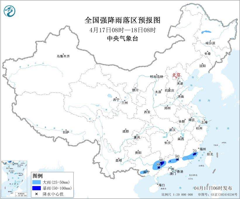 預計,4月17日08時至18日08時,廣西東部和南部、廣東中北部、福建東南部等地部分地區有大雨,其中,廣西東部、廣東北部、福建東南部等地部分地區有暴雨(50~90毫米)。上述部分地區伴有短時強降水(最大小時降雨量20~40毫米,局地可超過50毫米),局地有雷暴大風或冰雹等強對流天氣。