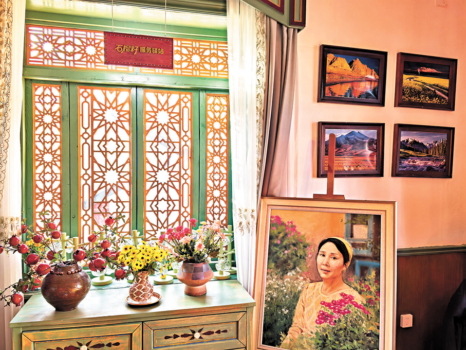 推開餐廳木門的瞬間,彷彿一鍵穿越進劇集:劇中主角圍坐暢談的餐桌原封不動,暖光吊燈垂下柔和光暈;牆上的艾德萊斯綢紋樣、木卡姆藝術掛畫、民俗雕花隔板,與熒幕畫面分毫不差。小院裏的石榴樹靜靜佇立,即便無花無果,也承載着劇集的溫暖記憶。角落的劇照展示區、演員簽名牆,記錄着拍攝時的點滴瞬間;連阿依夏媽媽的房間都完整保留,每一處細節都在訴說着熒屏與現實的溫柔聯結。
