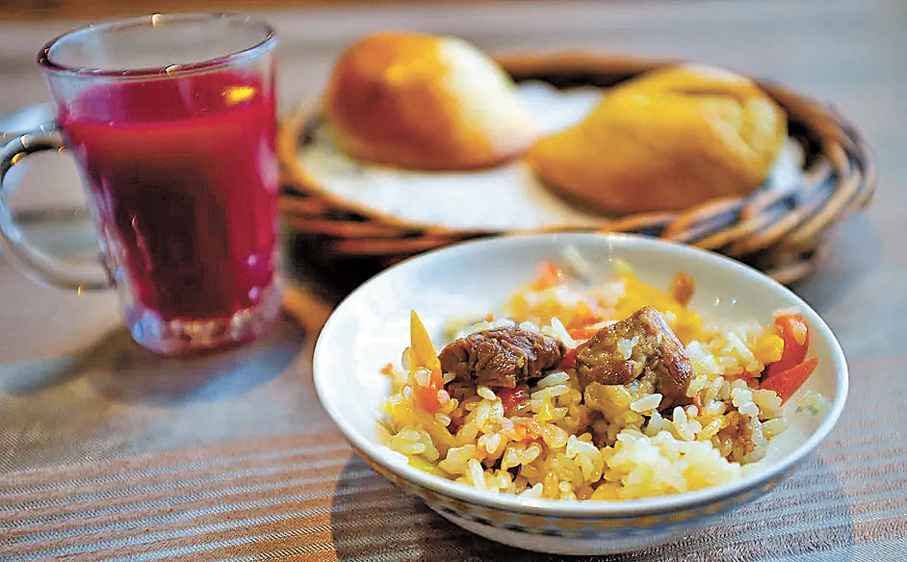 必嘗的「阿依夏抓飯」是餐廳的靈魂菜品,也是劇集裏的溫情符號。精選本地優質羊肉、飽滿大米與清甜胡蘿蔔,以羊油慢火燜製,火候掌握得恰到好處。出鍋後米粒油亮分明、軟糯筋道,羊肉酥爛入味、毫無膻味,胡蘿蔔的甜香與羊肉的鮮香交融,入口溫潤醇厚,每一口都藏着家常的溫暖。搭配兩個剛出爐的烤包子與一杯現榨石榴汁,更是人間絕配。薄脆的麵皮裹着羊肉丁與洋葱,在囊坑中烤至金黃,咬下一口酥脆掉渣,餡料鮮嫩多汁,孜然與胡椒的香氣與石榴汁的鮮甜在舌尖散開,豪邁的西域風味直擊味蕾。