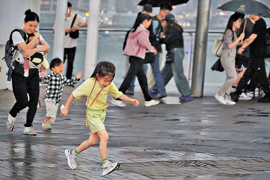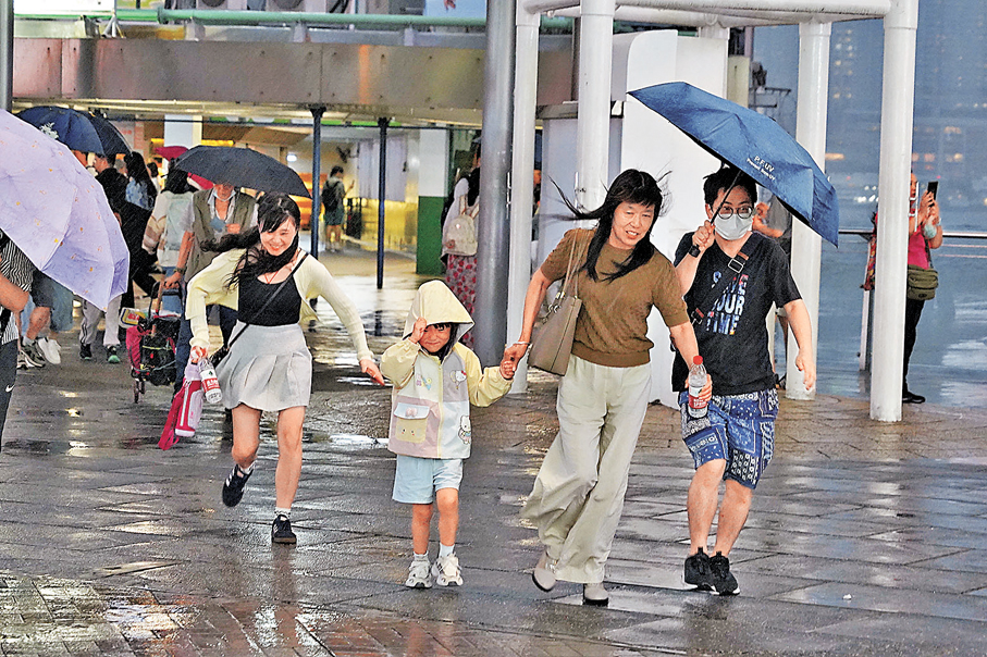 香港昨日下午時分有暴雨來襲,天文台一度發出黃色暴雨警告。在尖沙咀碼頭旁,孩子們在濕滑的地板上賣力奔跑,臉上帶着與雨景反差的生氣;大人們則以雙手護住懷抱,在風雨中築起堅實防線。 ●圖:香港文匯報記者 曾興偉