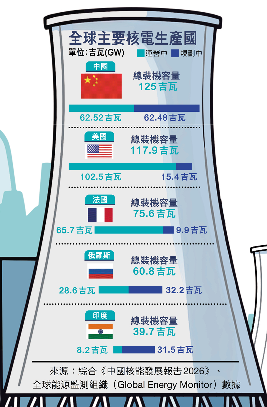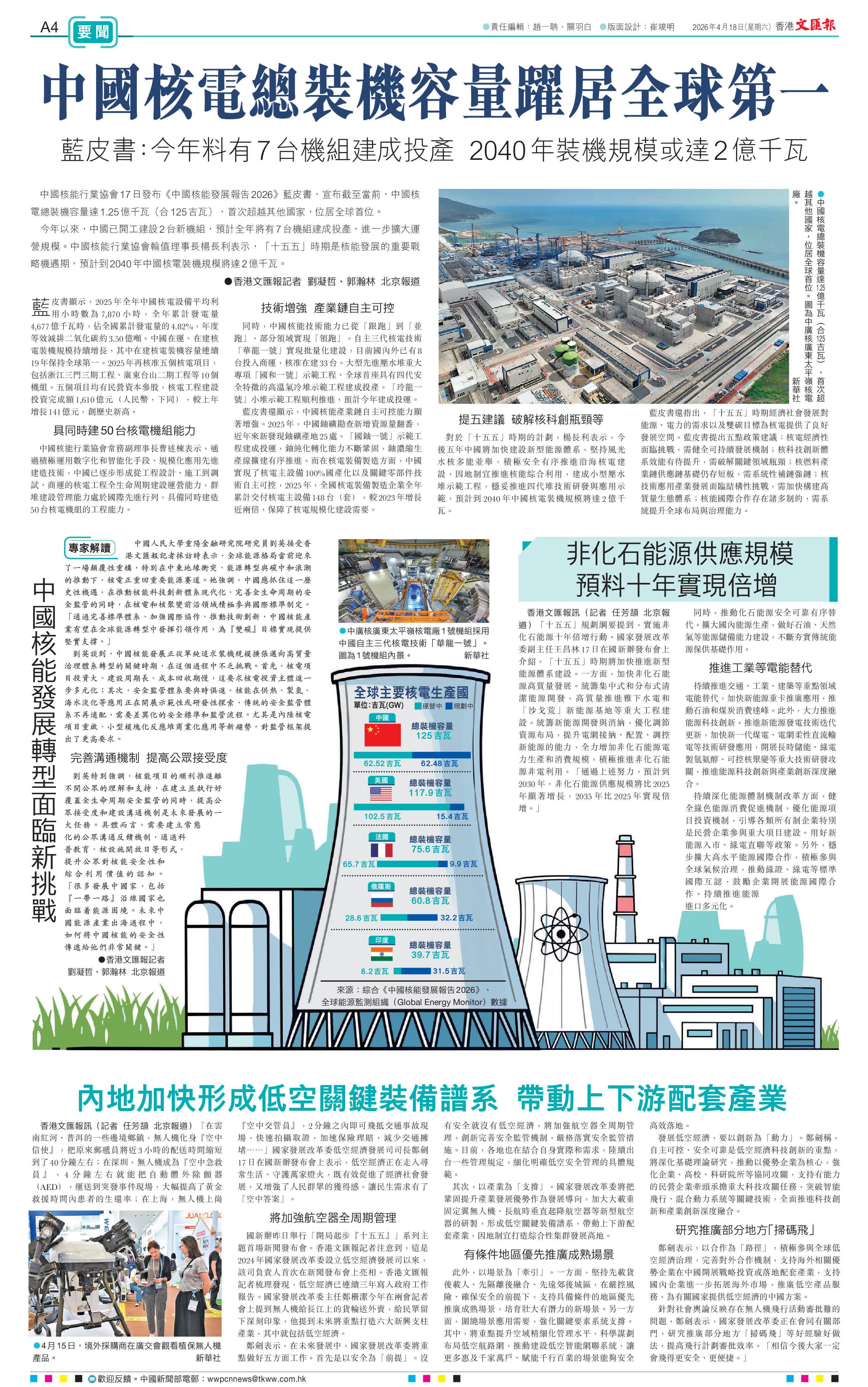 香港文匯報訊(記者 劉凝哲、郭瀚林)中國核能行業協會17日發布《中國核能發展報告2026》藍皮書,宣布截至當前,中國核電總裝機容量達1.25億千瓦(合125吉瓦),首次超越其他國家,位居全球首位。
