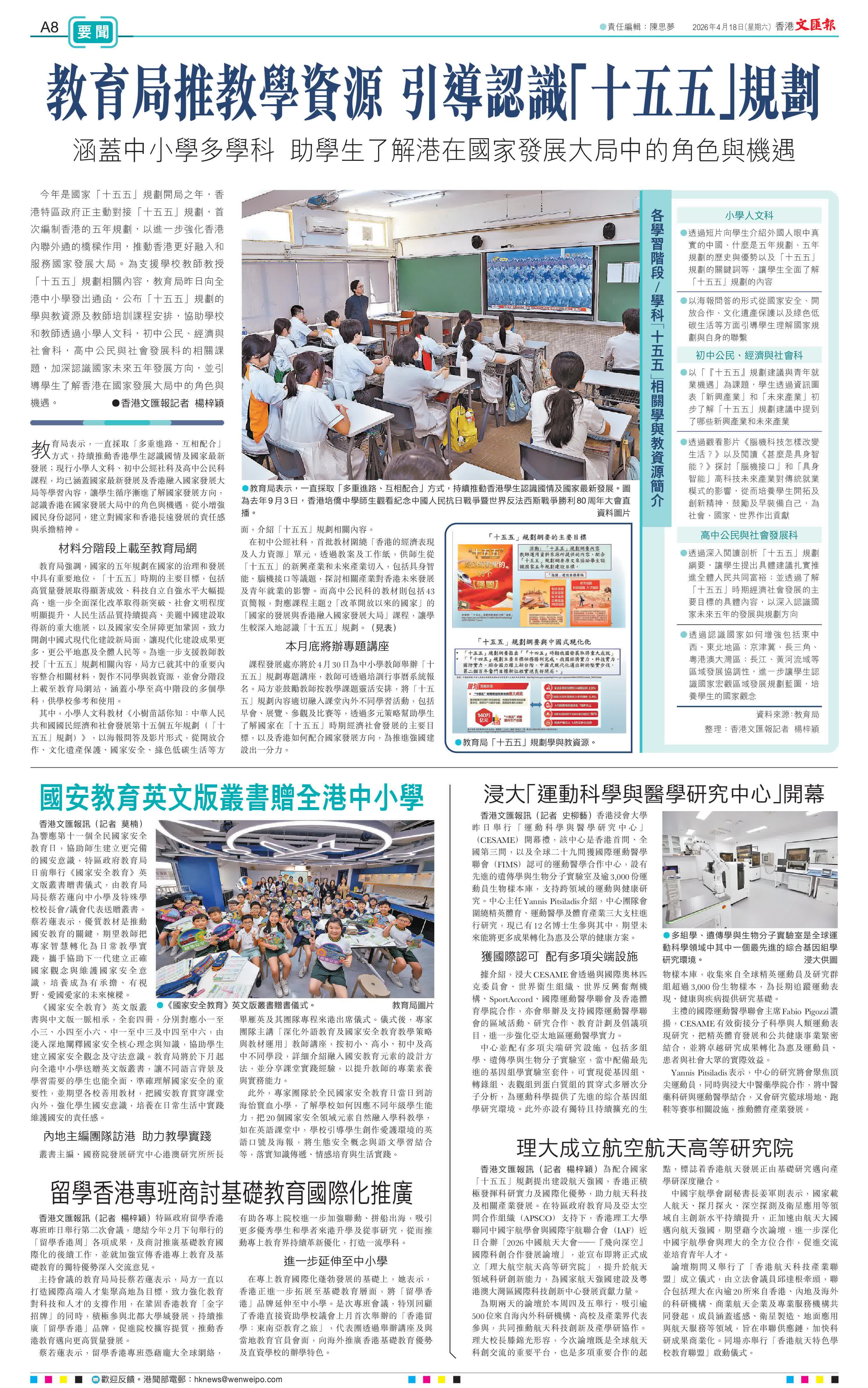 香港文匯報訊(記者 楊梓穎)今年是國家「十五五」規劃開局之年,香港特區政府正主動對接「十五五」規劃,首次編制香港的五年規劃,以進一步強化香港內聯外通的橋樑作用,推動香港更好融入和服務國家發展大局。為支援學校教師教授「十五五」規劃相關內容,教育局昨日向全港中小學發出通函,公布「十五五」規劃的學與教資源及教師培訓課程安排,協助學校和教師透過小學人文科,初中公民、經濟與社會科,高中公民與社會發展科的相關課題,加深認識國家未來五年發展方向,並引導學生了解香港在國家發展大局中的角色與機遇。