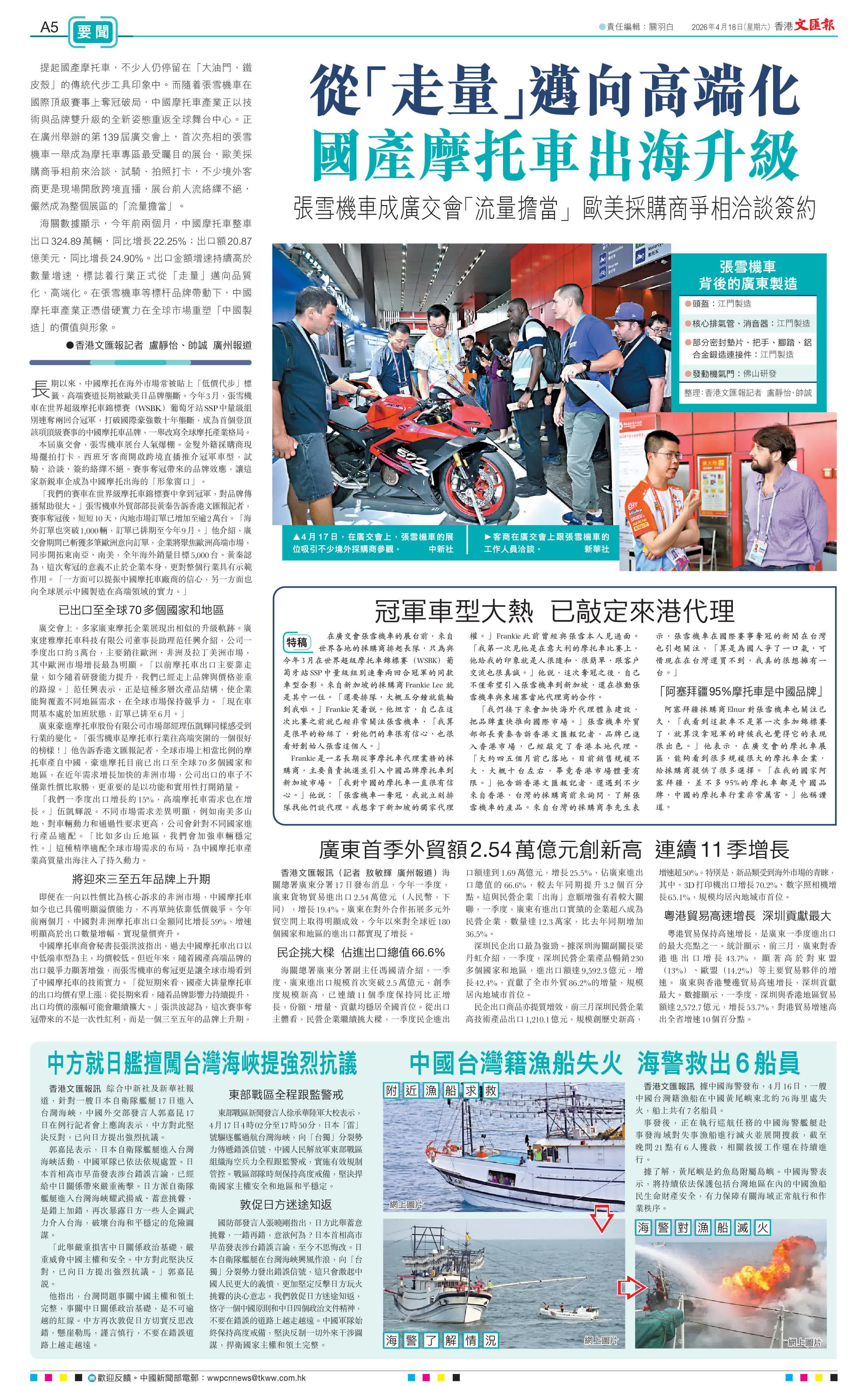 香港文匯報訊(記者 盧靜怡、帥誠)提起國產摩托車,不少人仍停留在「大油門、鐵皮殼」的傳統代步工具印象中。而隨着張雪機車在國際頂級賽事上奪冠破局,中國摩托車產業正以技術與品牌雙升級的全新姿態重返全球舞台中心。正在廣州舉辦的第139屆廣交會上,首次亮相的張雪機車一舉成為摩托車專區最受矚目的展台,歐美採購商爭相前來洽談、試騎、拍照打卡,不少境外客商更是現場開啟跨境直播,展台前人流絡繹不絕,儼然成為整個展區的「流量擔當」。