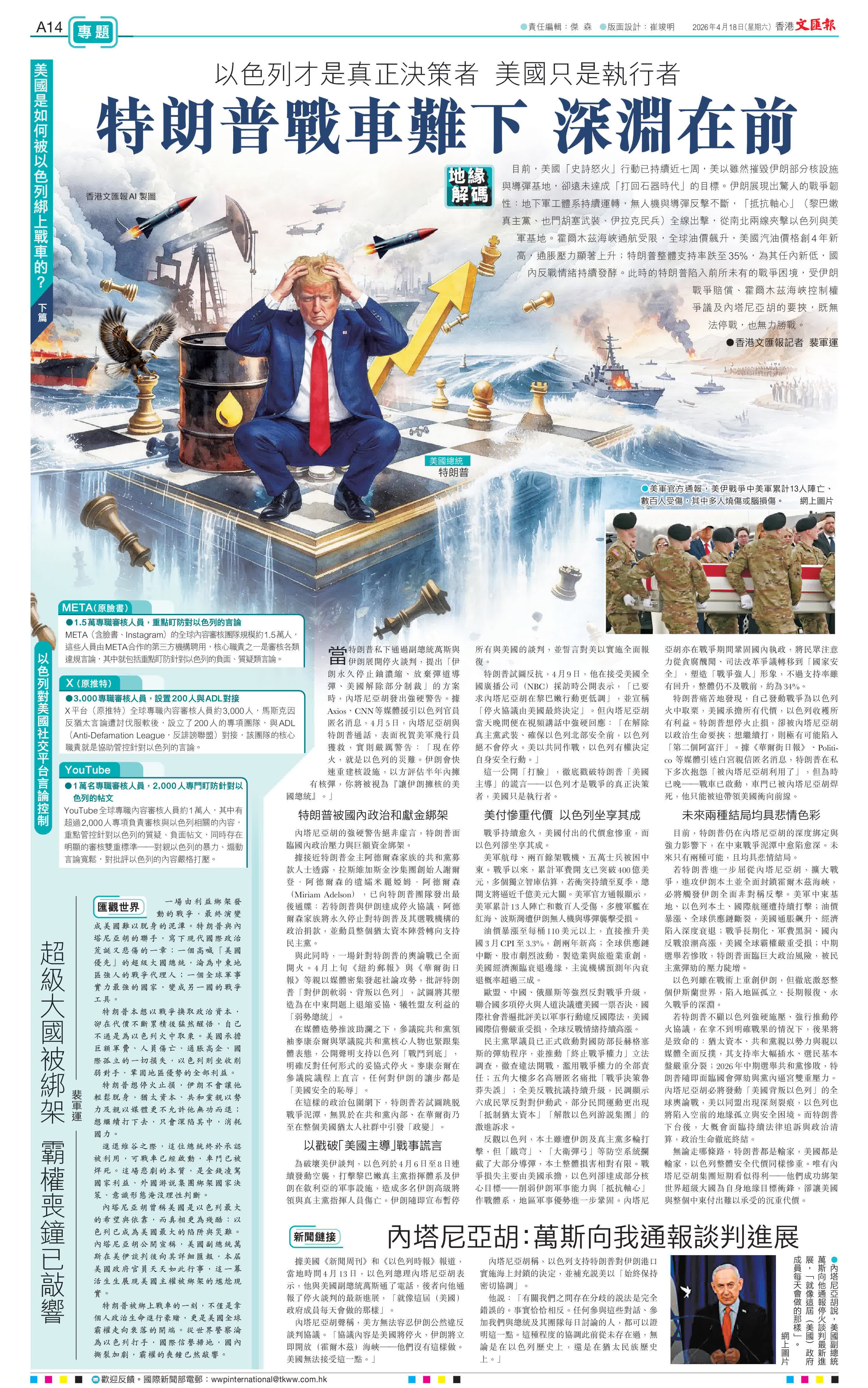內塔尼亞胡曾稱美國是以色列最大的希望與依靠,而真相更為殘酷:以色列已成為美國最大的陷阱與災難。內塔尼亞胡公開宣稱,美國副總統萬斯在美伊談判後向其詳細匯報,本屆美國政府官員天天如此行事,這一幕活生生展現美國主權被綁架的尷尬現實。