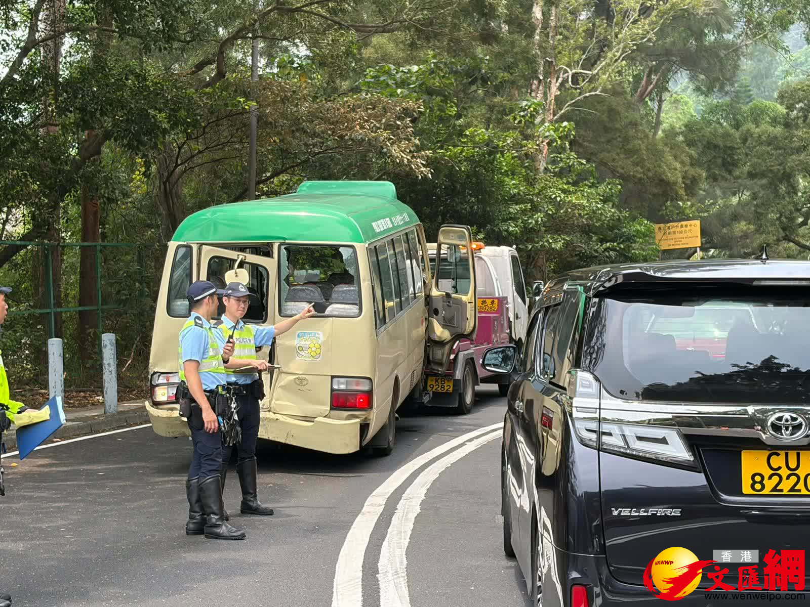 據了解,事發時小巴往大帽山方向行駛,至可觀自然教育中心停車落客,惟尾隨輕型貨車疑收掣不及撞向小巴車尾。警方經初步調查,輕型貨車司機涉嫌危險駕駛被捕,現正被扣留調查。