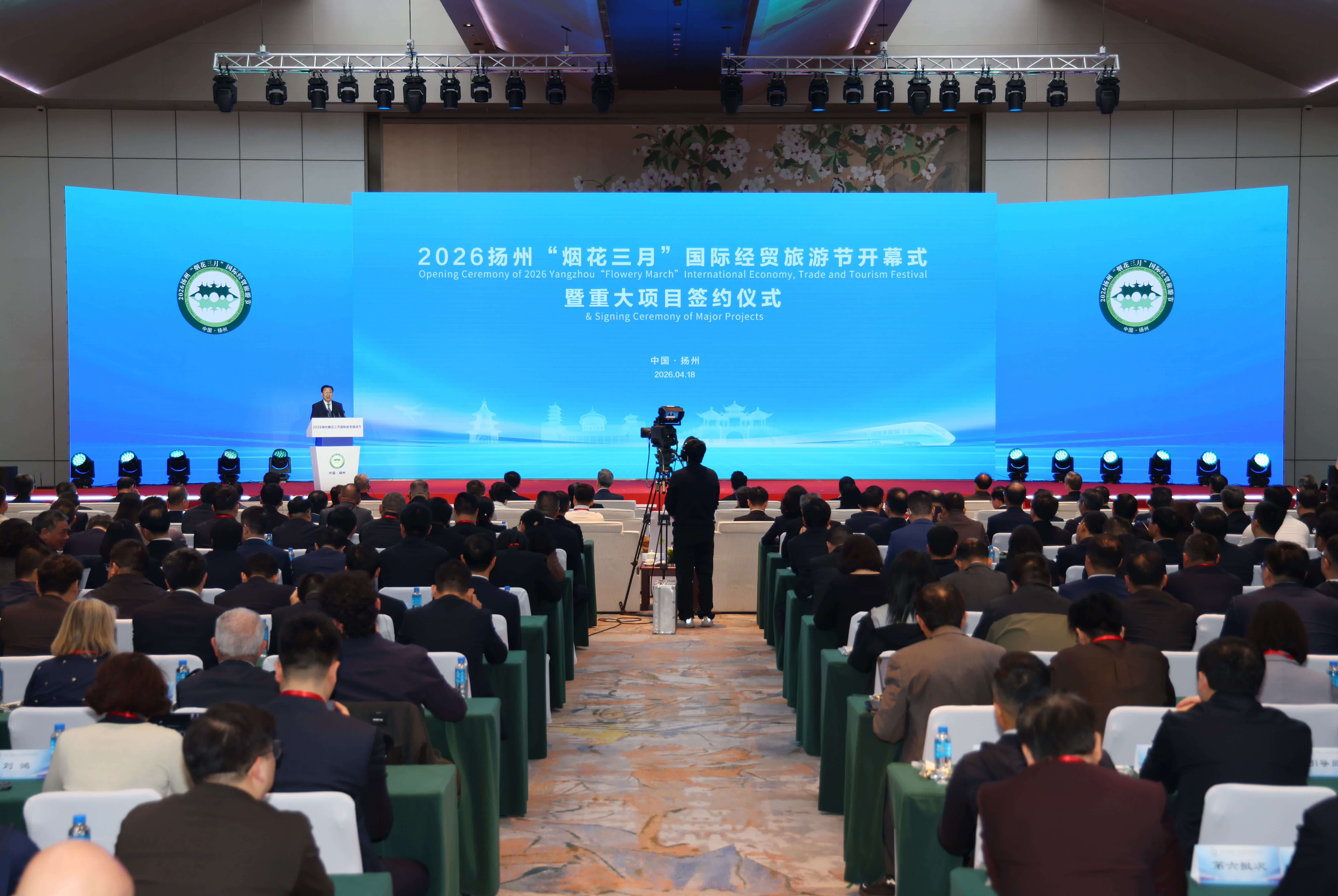 香港文匯報訊 春光正好,盛會如約。4月18日上午,2026揚州「煙花三月」國際經貿旅遊節開幕式在古運河畔的凱賓斯基酒店舉行。韓國駐華大使盧載憲,埃及駐華大使哈立德·納茲米,柬埔寨磅通省省長農帕拉,中國能源建設集團有限公司黨委委員、總經濟師周小能,國際電信聯盟前秘書長趙厚麟,香港太平紳士、東海聯合(集團)董事局主席黃楚標,大灣區航空董事、香港特別行政區第七屆立法會主席梁君彥,香港科技大學校董會主席沈向洋,上海美國商會會長鄭藝,揚州大學黨委書記丁建寧,上海交通大學黨委常委、副校長管海兵,土耳其駐滬總領事歐姿蘭·庫拉,香港新型工業化聯盟主席杜鵬,深商會聯合黨委書記林慧,柬埔寨環境部副國務秘書哈維賽特,中國數字文化集團副總經理周廣明,中國日報社副總編輯邢志剛等中外嘉賓出席。揚州市市委書記王進健致辭,揚州市市委副書記、市長鄭海濤作揚州經濟社會發展推介。揚州市市人大常委會主任孔令俊,揚州市市政協主席陳揚,揚州市市委副書記、秘書長焦慶標參加活動。