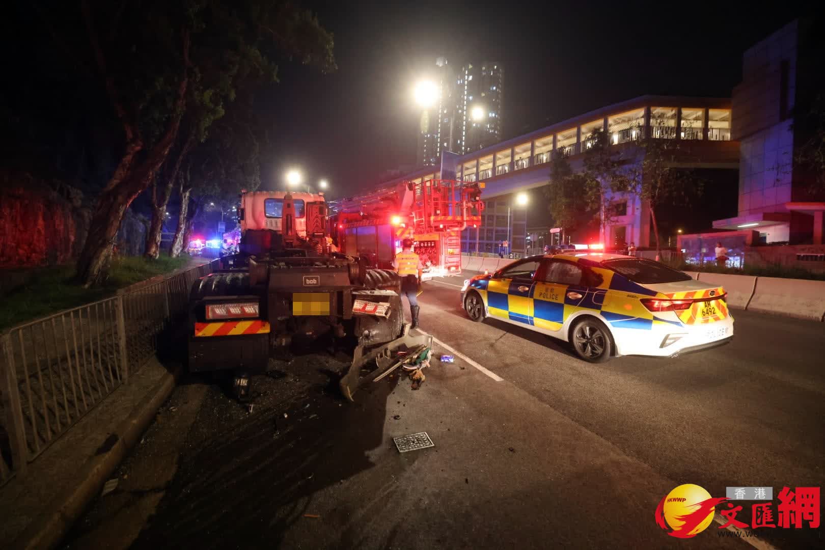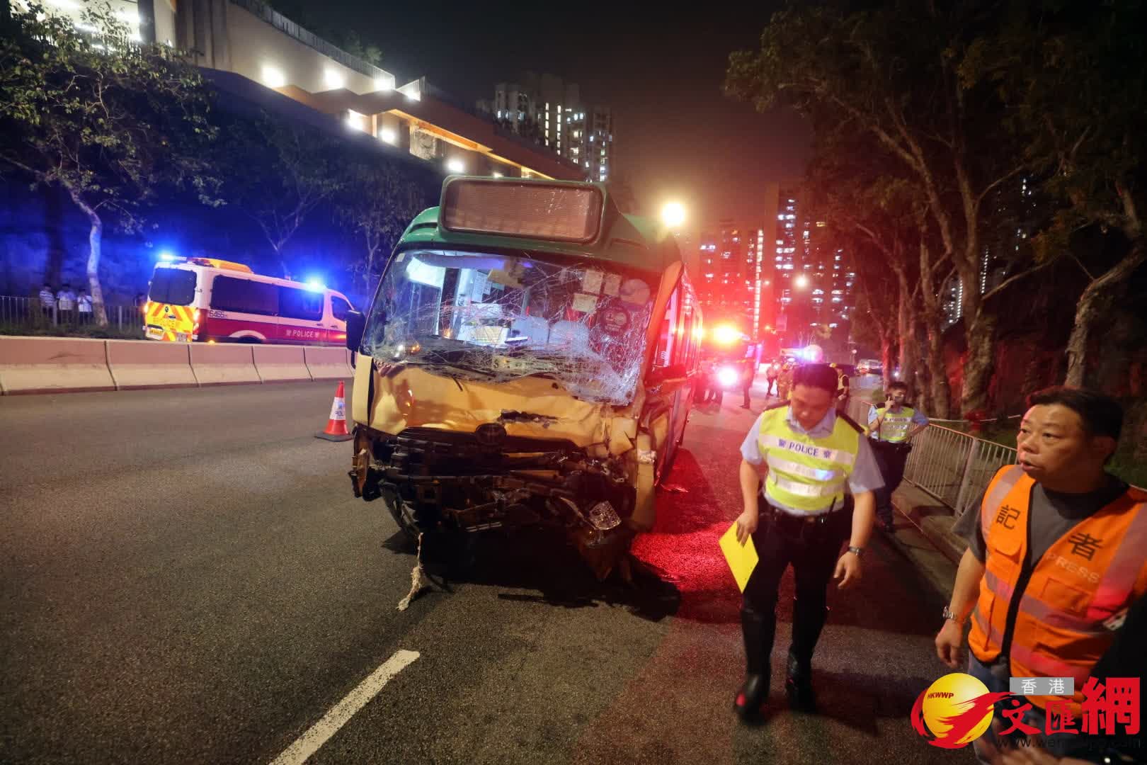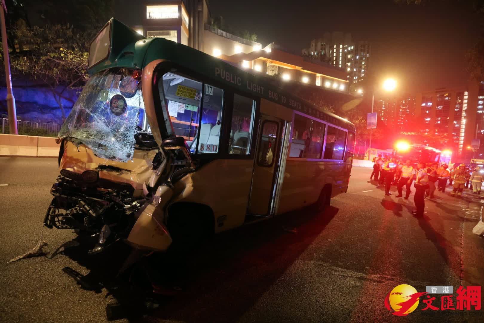 香港文匯報訊(記者 蕭景源)香港文匯報訊(記者 蕭景源)今日(18日)晚上約9時30分,一輛專線小巴與一輛環保斗勾車,在青衣長康路青俊苑對開發生相撞,專線小巴車頭嚴重損毀,據悉現場有14人受傷,當中2人傷勢嚴重,期間有傷者坐在車內待救,另有傷者落車後坐在地上等待救援。
